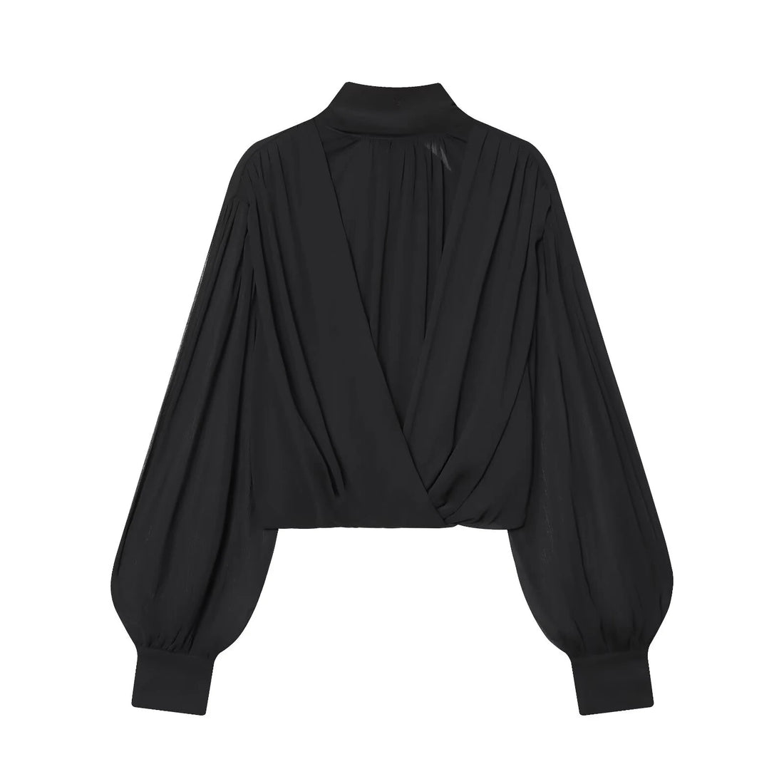 2025 Winter New Product Women's Stand up Collar Long Sleeve Puff Design Short Half Transparent Folded Balloon Shirt