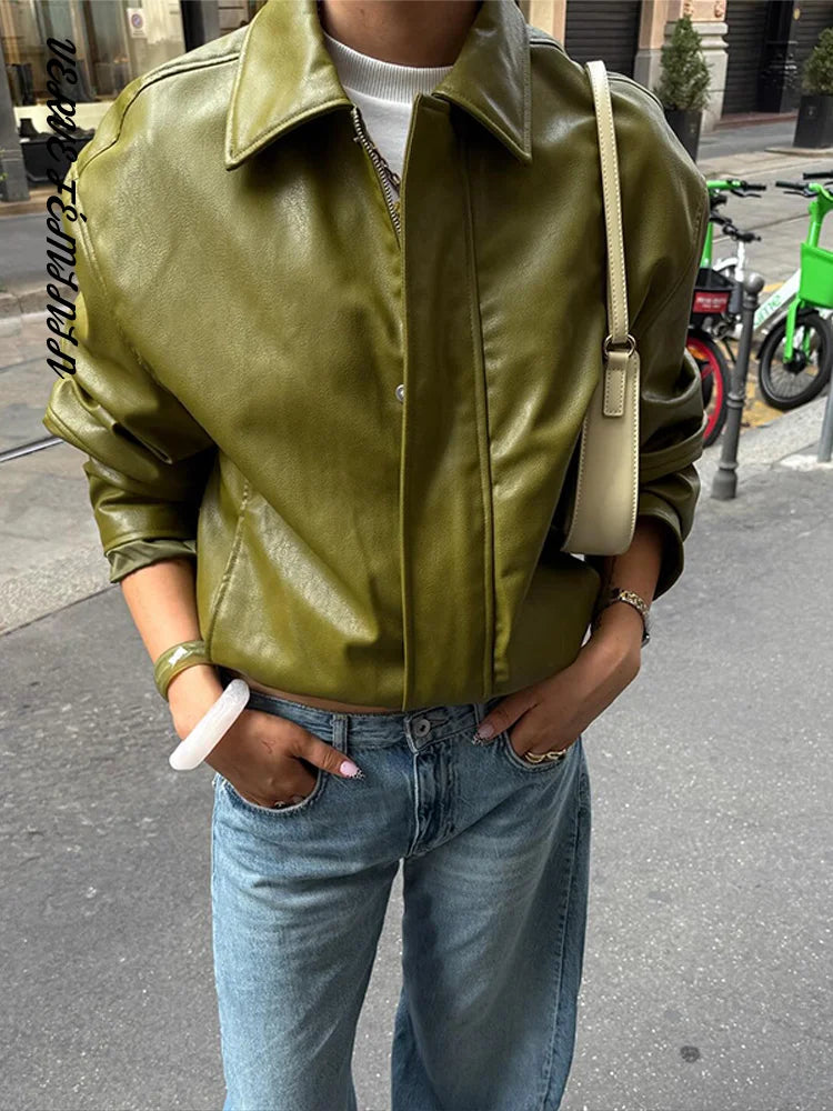 Women's Bomber Coats Lapel Zipper Solid Leather Jacket Autumn 2025 Female Turn-down Collar Full Sleeve Coats Chic Lady Outerwear