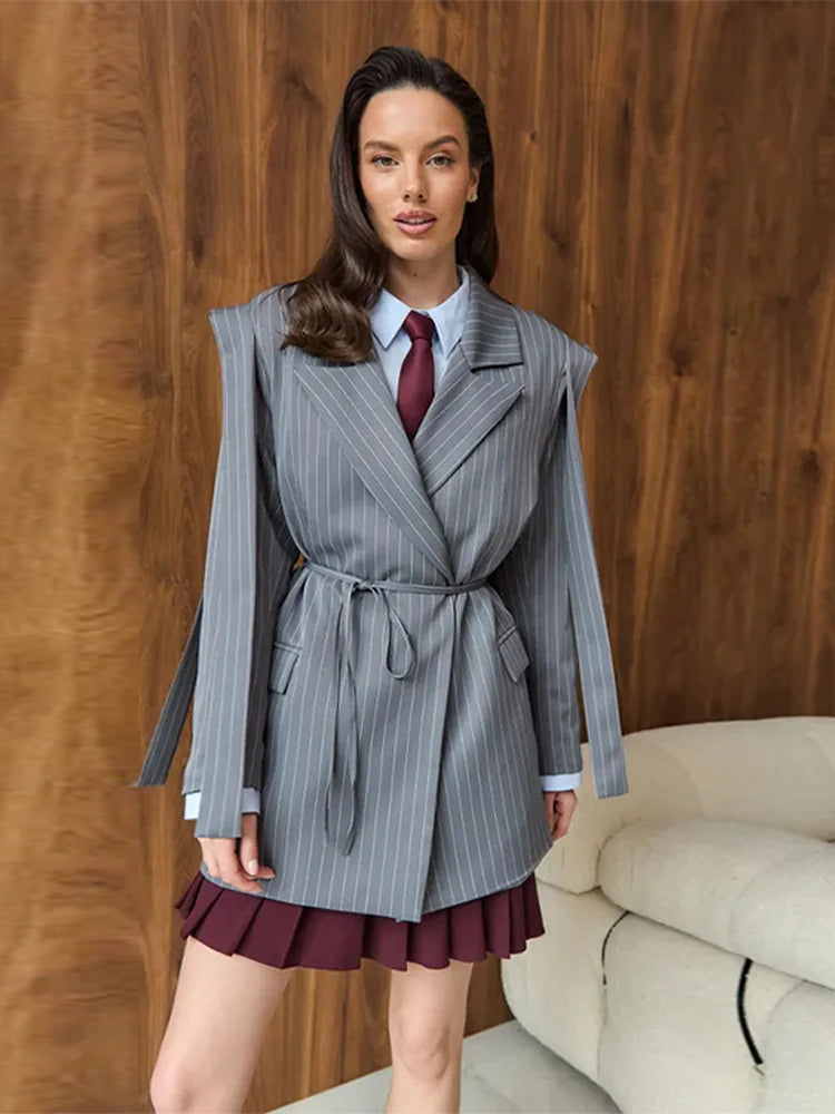 Elegant Striped Slim Women's Blazers Turn-down Collar Shoulder Pad Full Sleeve Waist Cinching Suit Jacket Chic Ladies Outerwear