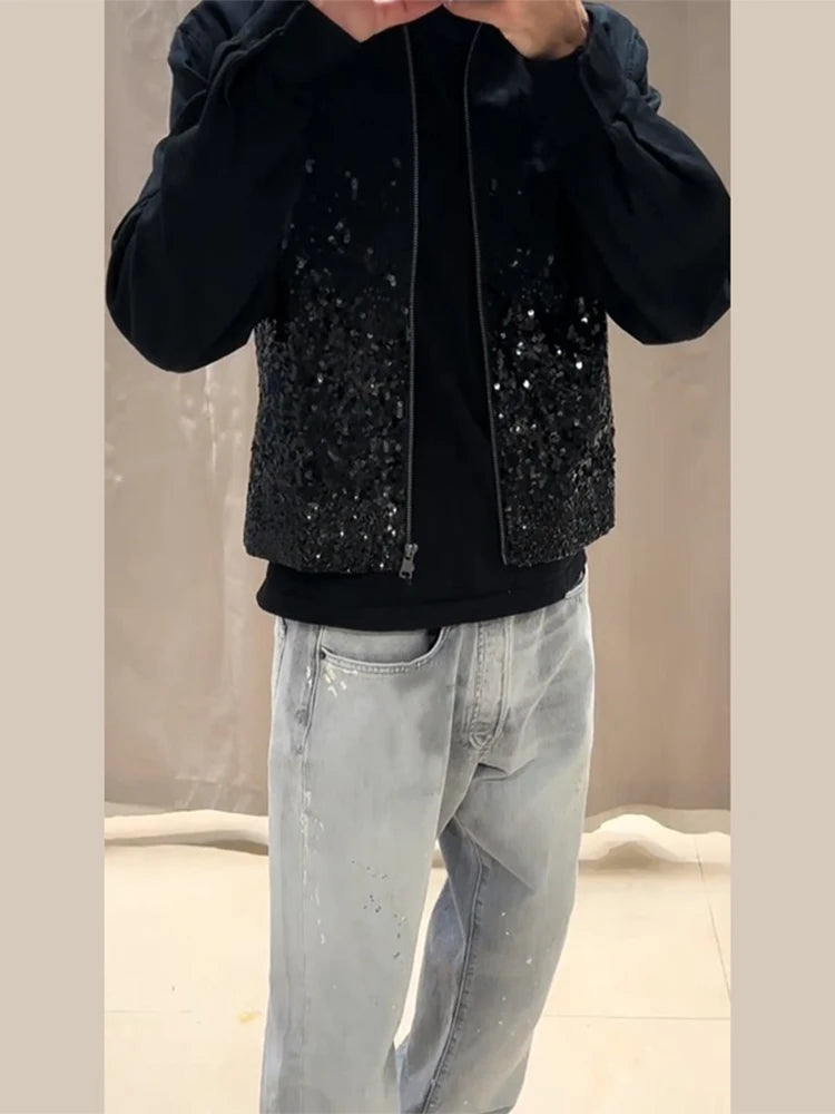 Men's Bomber Coats Sequined Lapel Zipper Jacket Autumn 2025 Shining Long Sleeve Loose Jackets Fashion Party Nightclub Outerwears