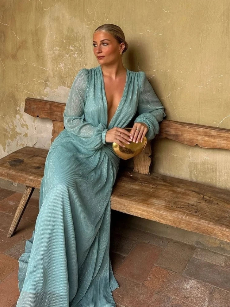 Sexy Solid Slim Women's Maxi Dress Deep V-neck Hollow Out Lantern Long Sleeve Backless Dragging Party Dresses Chic Ladies Robes