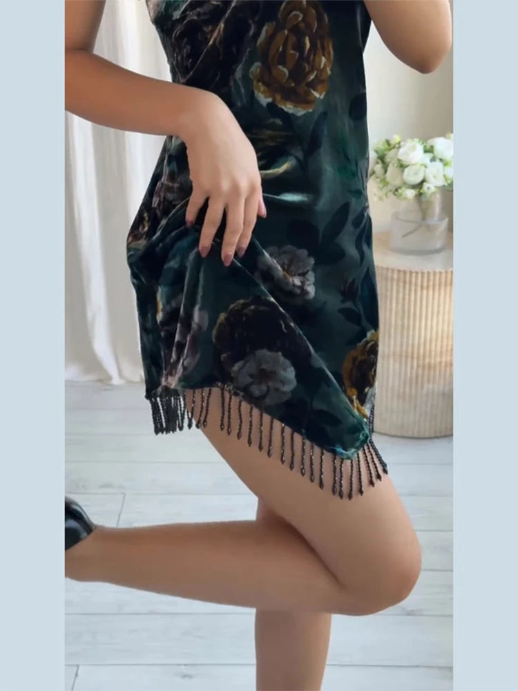 Women's Evening Dresses Tassels Velvet Printed Short Dress Autumn 2025 Female Sleeveless Backless Irregular Partywear Streetwear