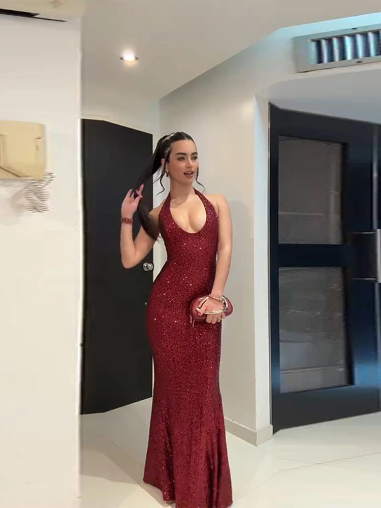 Women's Evening Dresses Halter Sequined Long Dress Shining Female Sleeveless Waist Cinching Party Vestido Sexy Ladies Partywear