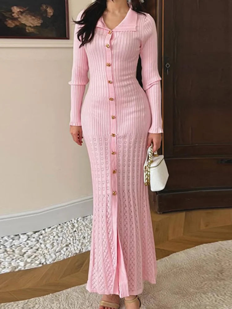 Women's Evening Dresses Lapel Button Knitted Long Dress Early Spring Female Full Sleeve Single Breasted Slim Partywear Clubwear