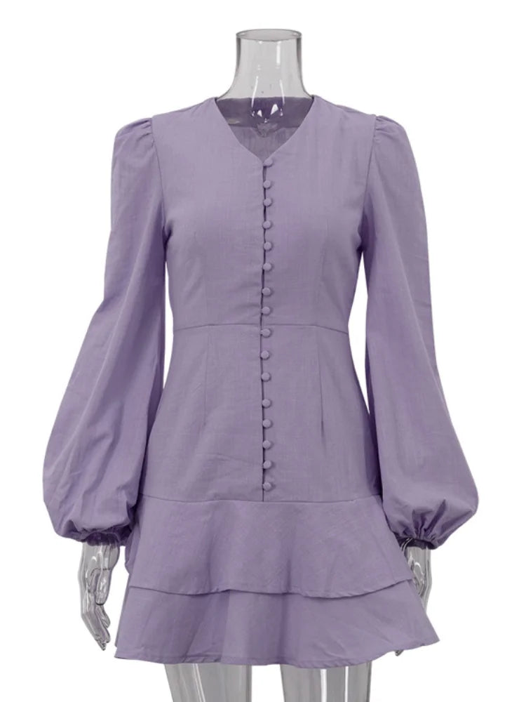 Sweet Solid Slim Women's Short Dress V-neck Lantern Full Sleeve Single Breasted Waist Cinching Ruffle Dresses Autumn Ladies Robe