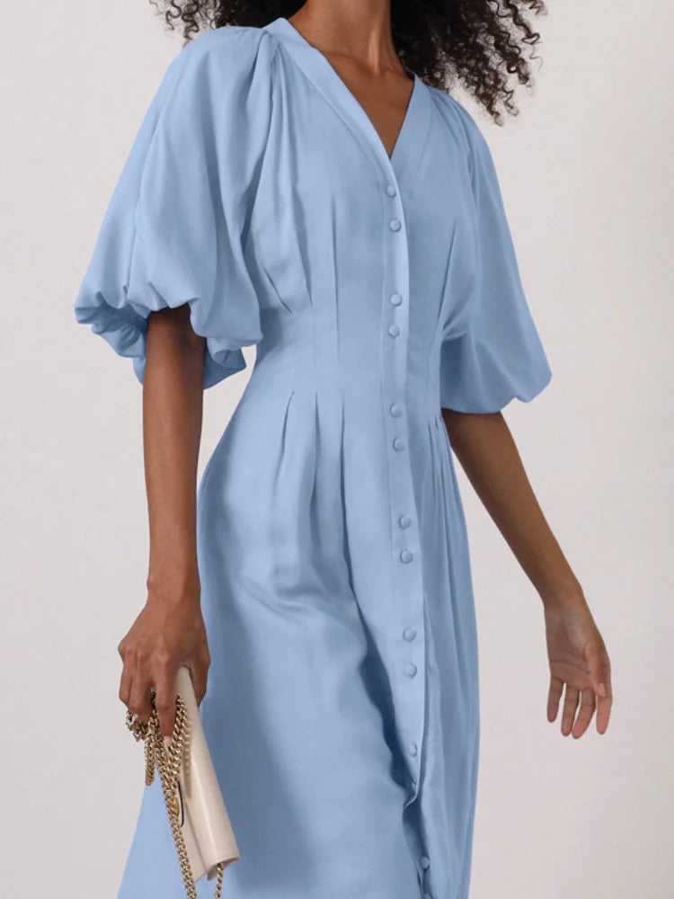 Elegant Solid Slim Women's Long Dresses V-neck Puff Short Sleeve Waist Cinching Single Breasted Pleated Partywear New Lady Robes