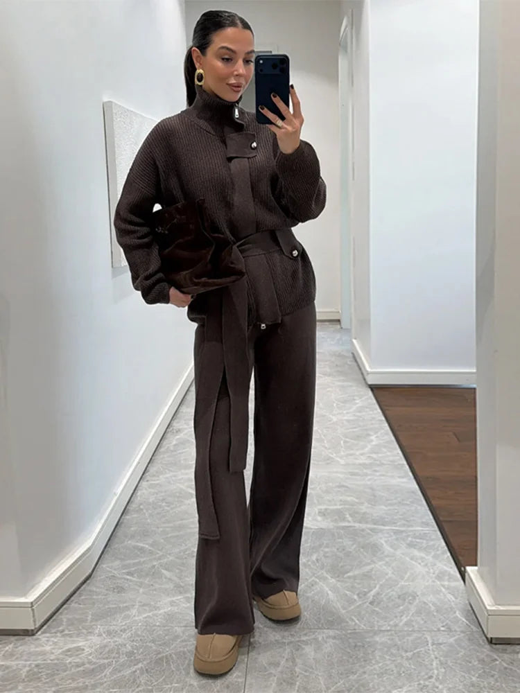 Solid Turtleneck Button Tie-Waist Knit Set Long Sleeve Sweater Wide Leg Pants 2025 Chic Vintage Women Sets Causal Cozy Lady Suit