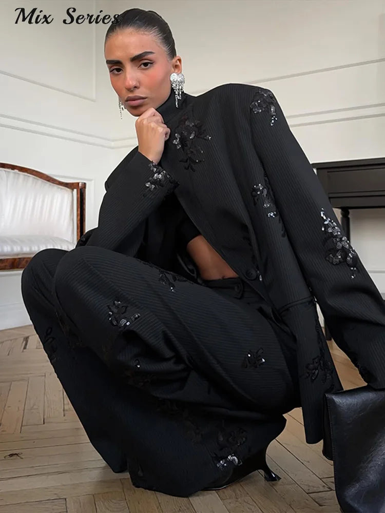 Sequin Women's Pant Set Elegant Lapel Patchwork Full Sleeve Blazer Long Straight Pant Suit Lady 2026 New Spring Woman Outwears