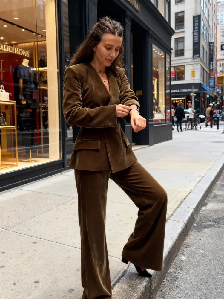 Women's 2 Pcs Suits V-neck Velvet Blazer Pants Sets Autumn 2025 Female Long Sleeve Slim Bomber Coats High Waist Trousers Outfits
