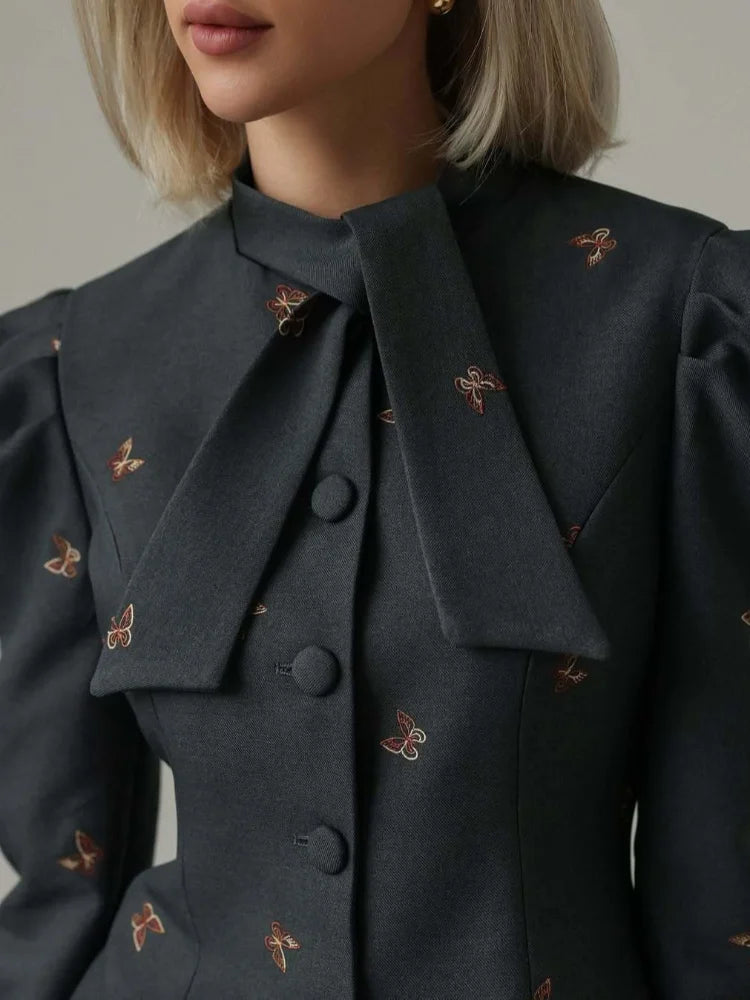 Vintage Embroidery Slim Women's 2 Pcs Suits Lace Up Bow Long Sleeve Single Breasted Jacket Short Skirts New Autumn Ladies Outfit