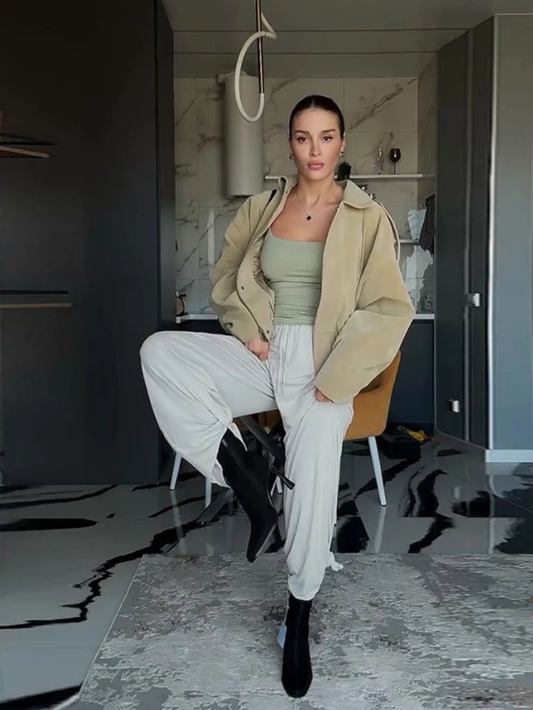 Lapel Pocket Ruched Loose Fitting Jacket Women Street Turn-down Collar Long Sleeve Shoulder Patch Coats New Autumn Chic Lady Top