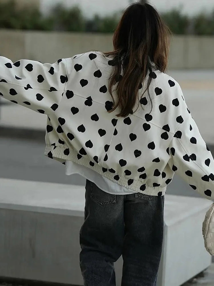 Street Heart-shaped Printed Loose Women's Jackets Turn-down Collar Lantern Long Sleeve Pilot Coats 2025 Early Autumn Ladies Tops