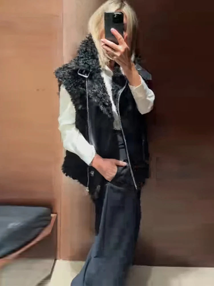 Women's Solid Faux Fur Vest Elegant Turtleneck Fluffy Short Tank Tops 2025 Autumn Winter Female Chic Sleeveless Jacket Coat New