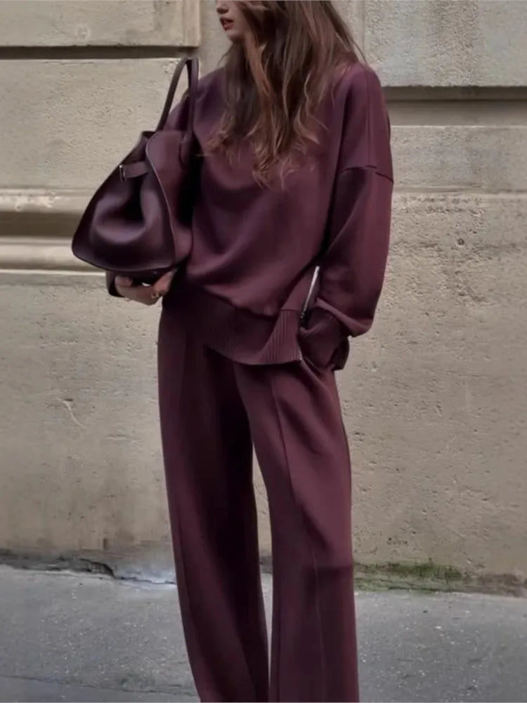 Women Autumn 2 Piece Set Casual Simple Solid Long Sleeve Turtleneck Pullover Top Loose Wide Legs Pants Sets 2025 Lady Outfit
