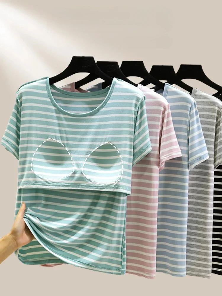 Modal Summer Chest Pad Short Sleeve Top Loose Bra-Free Stripe T-shirt Thin Versatile Outer Wear Bottoming Shirt