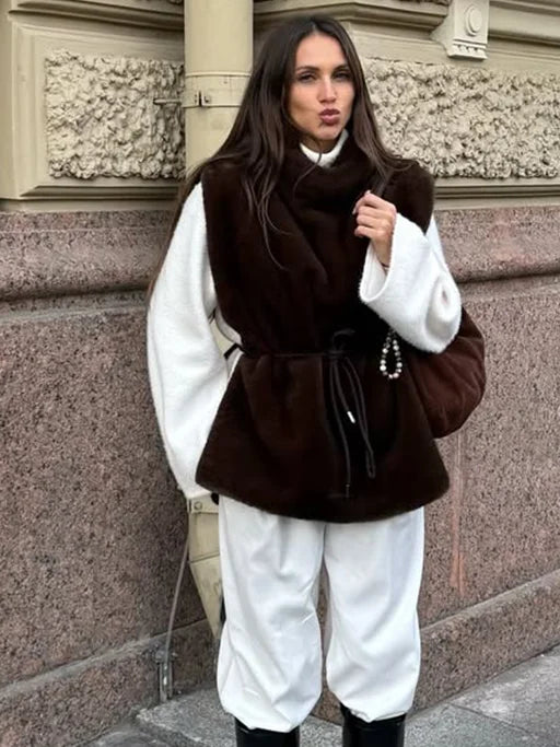 Brown Turtleneck Faux Fur Vest Women's Fashion Thicken Fluffy Sleeveless Lace Up Slim Fit Top 2025 Winter Lady Daily Outerwear