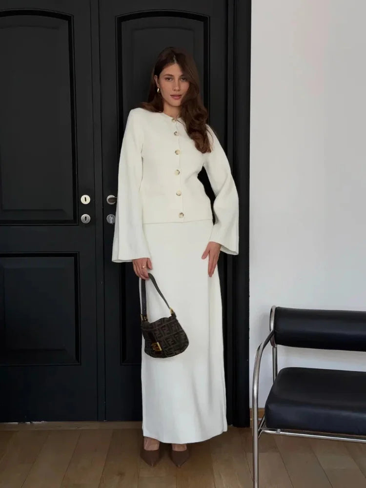 Knit Single Breasted Cardigan Long Skirt Suits Women Causal O-neck Full Sleeve Tops High Waist Skirts Fashion Office Lady Outfit