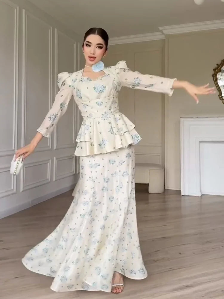 Sweet Printed Slim Women 2 Pcs Suits Full Sleeve Waist Cinching Ruffles Tops High Waist Hip Package Long Skirts Office Lady Sets