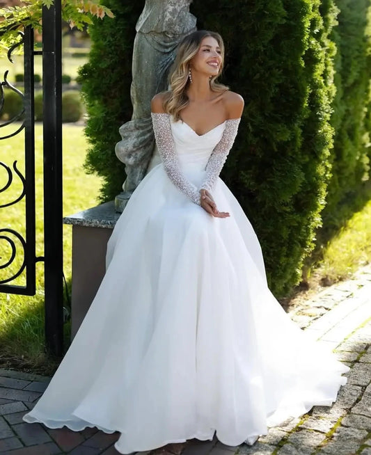 Shiny Beaded Sequined Wedding Dresses 2026 Detachable Long Sleeves Strapless A Line Organza Bride Dress Bridal Gowns Sweep Train