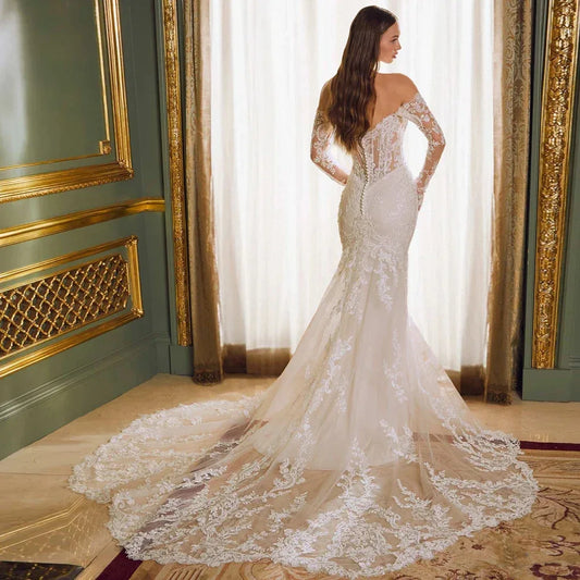 Classic Lace Mermaid Wedding Dress Long Sleeves V-neck Pearls Buttons Bridal Gown Elegant Bridal Dress Brides Vestido De Noiva