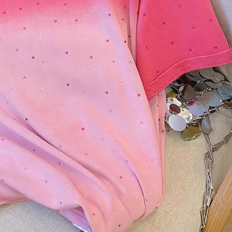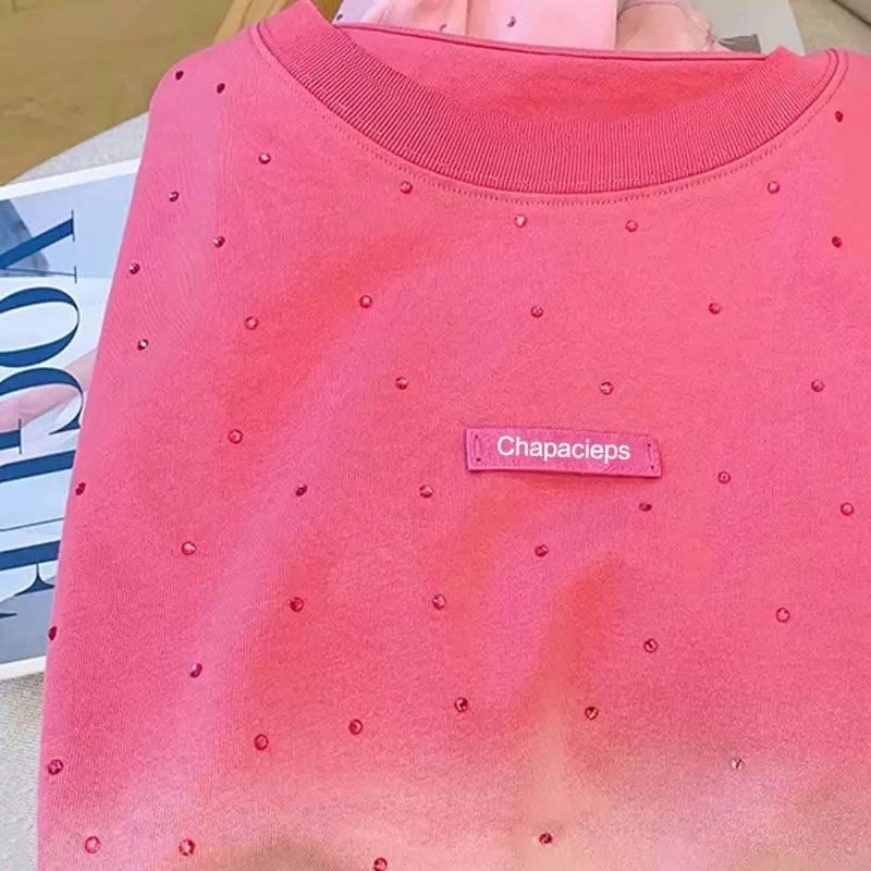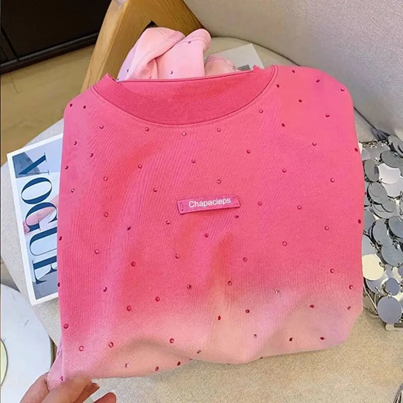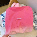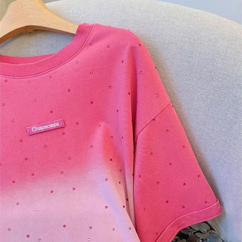 100% Cotton American Hiphop Retro Heavy Industry Hot Diamond Short-sleeved T-shirt Women's Gradual Change Summer New Loose Top