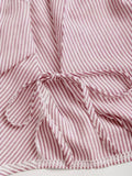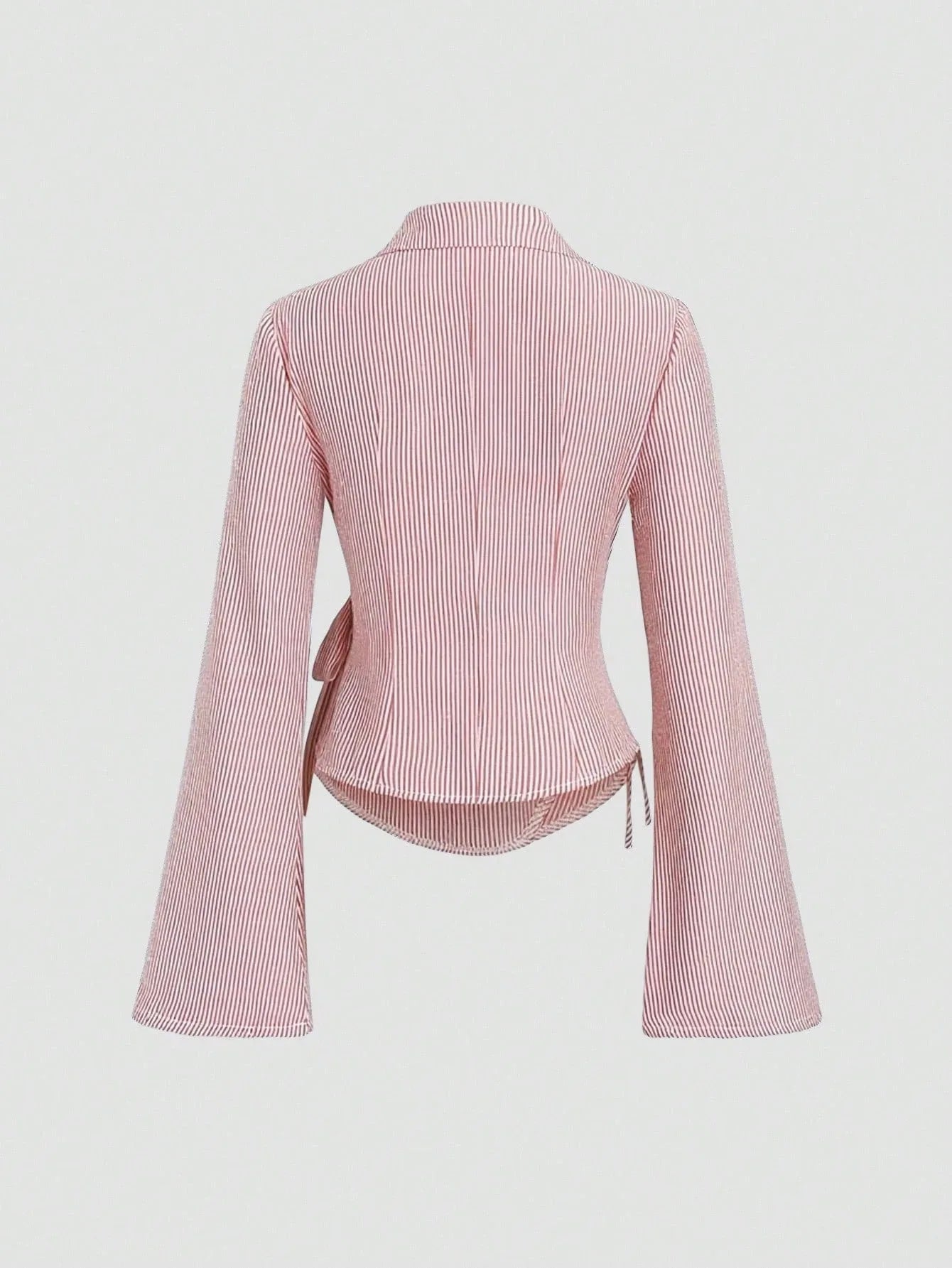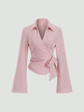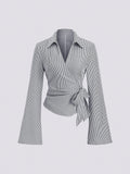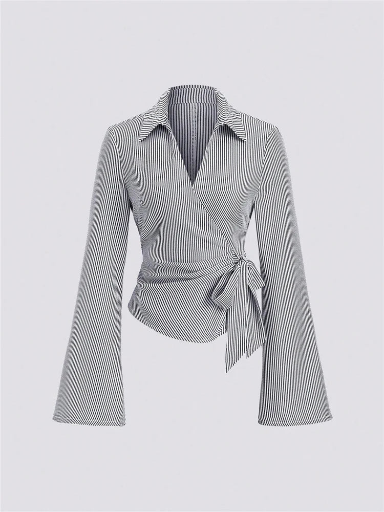 2026 Spring Summer Lace Up Striped Blouse Women Flare Sleeve Lapel Slim Fit Crop Tops Streetwear Chic Shirt Office Lady T Shirt