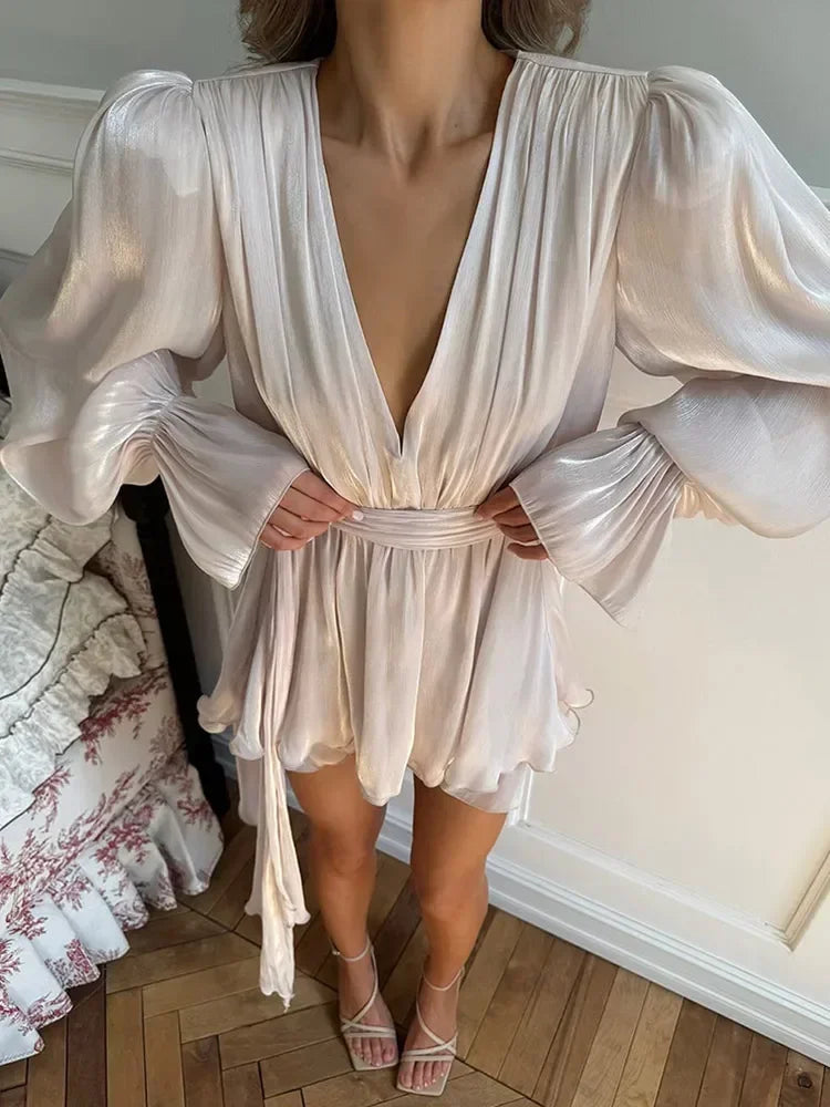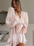 Chic Chiffon Lantern Sleeve Ruffles Dress Women's Elegant High Waist Pleated A-line O-neck Gowns Summer Party Club Vestidos 2025