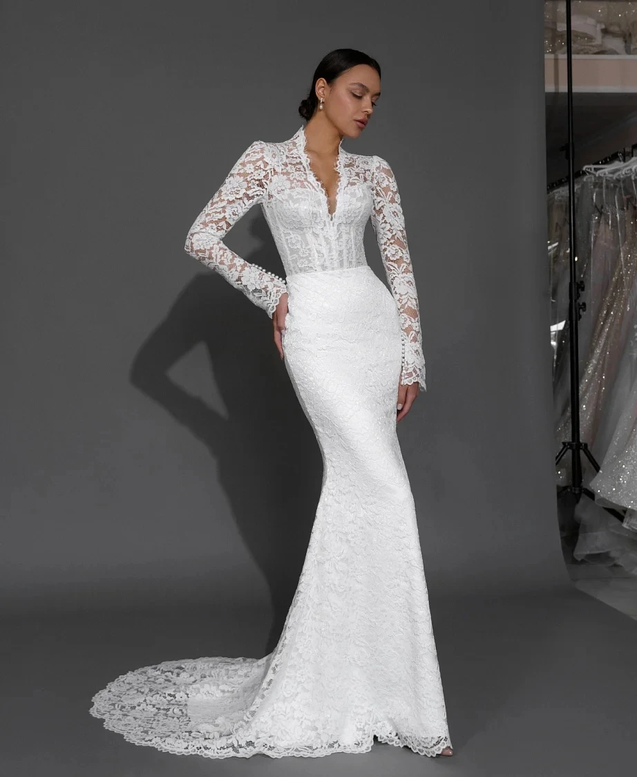 Classic Lace Mermaid Wedding Dress Long Sleeves V-neck Pearls Buttons Bridal Gown Elegant Bridal Dress Brides Vestido De Noiva