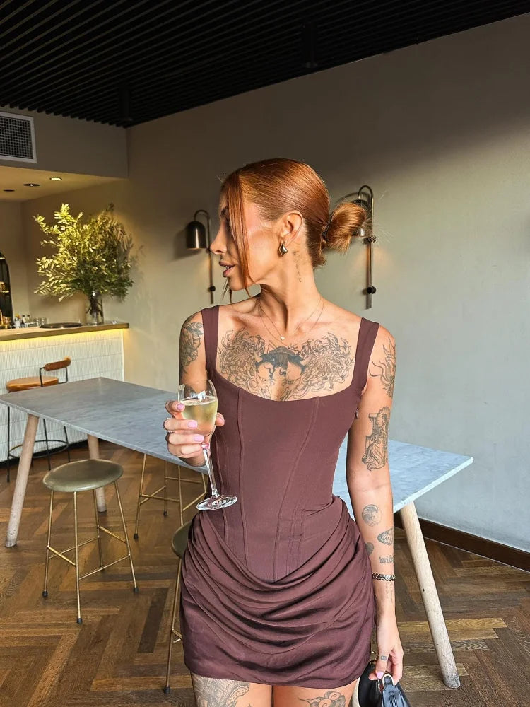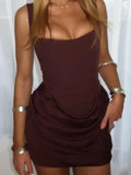 Deep Brown Sling Mini Dress Women's Elegant Square Neck Sleeveless Pleated Hem Robe 2025 Summer Holiday Short Daily Street Wear