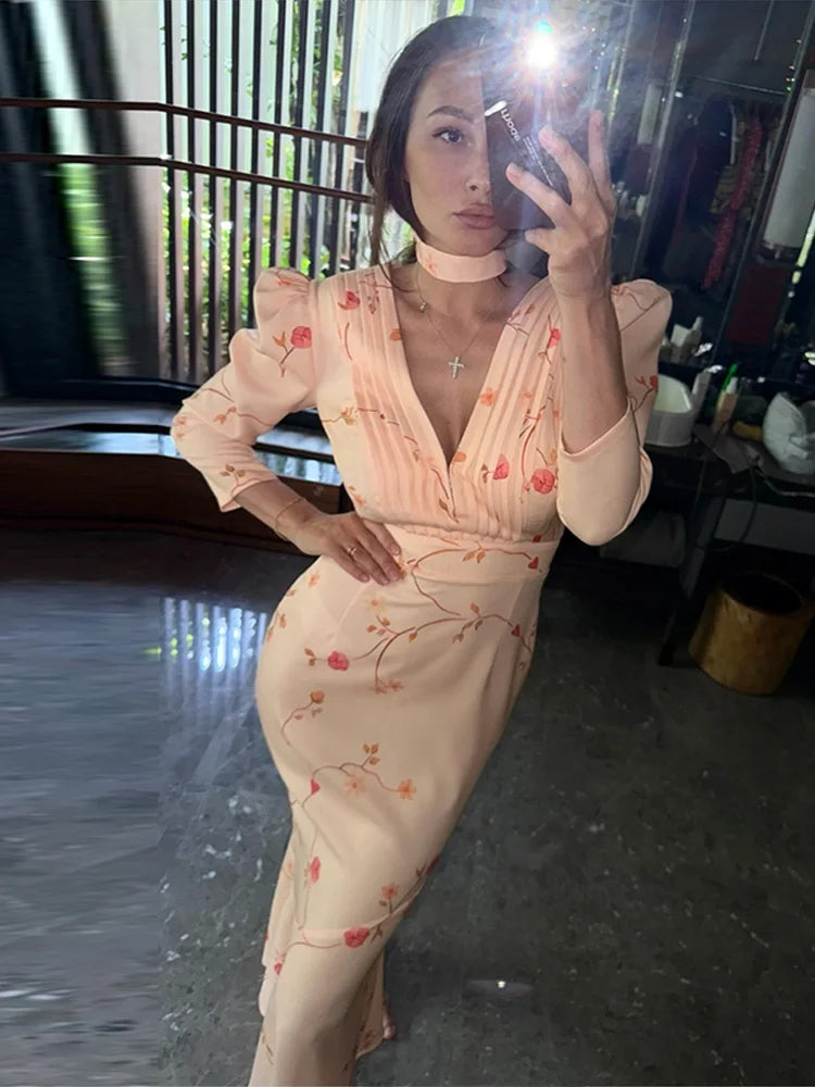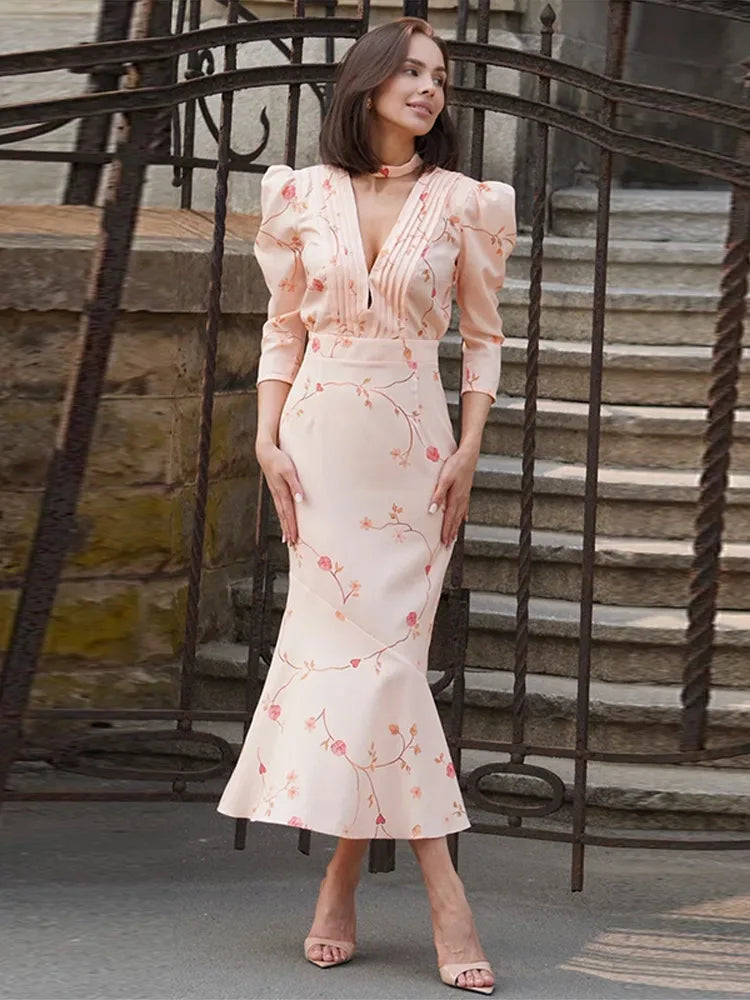 Deep V-neck Shoulder Pad Printed Long Dress Women Elegant Short Sleeve Waist Cinching Slim Evening Dresses New Ladies Streetwear