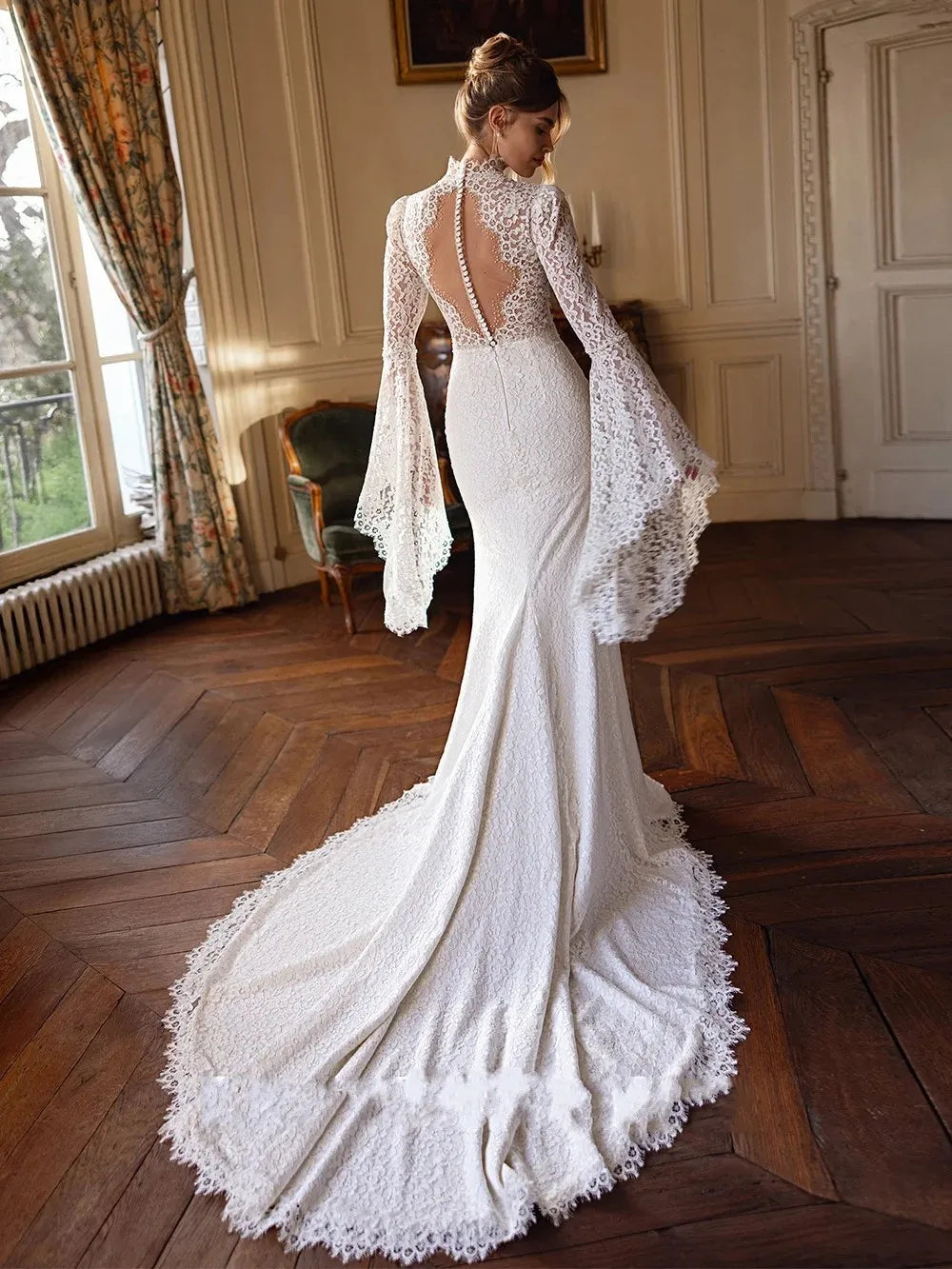 Elegant Lace Wedding Dress 2026 High-neck Long Sleeves Buttons Back Sweep Train Bridal Bride Gown Classic vestidos de novia