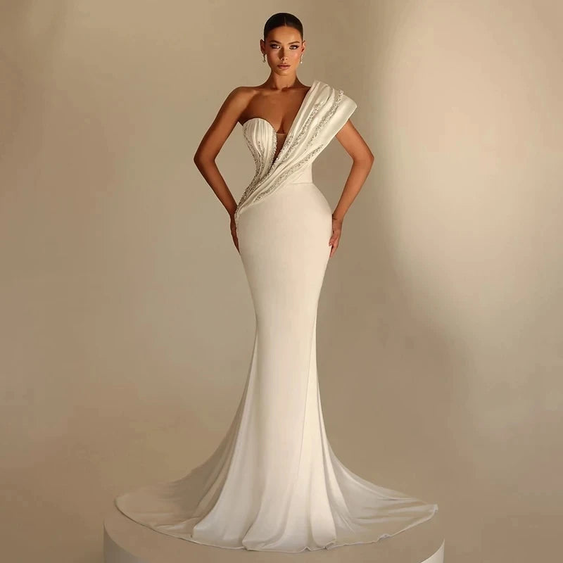 Elegant Mermaid Wedding Dress One Shoulder Pleats Beads Bridal Dresses Bride Gown Church vestidos de novia