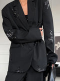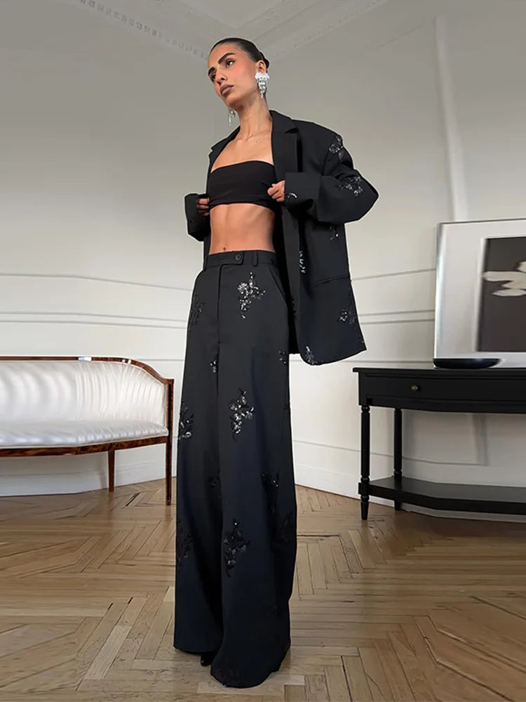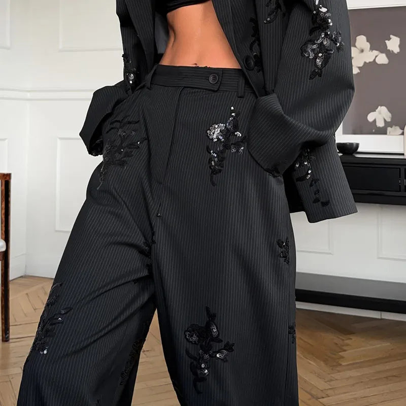 Elegant Stripe Sequin Top Pant Suit Sets Women Fashion Black Lapel Neck Loose Single Breasted Coat Leg Loose Pants Set Lady Sets