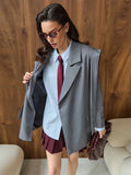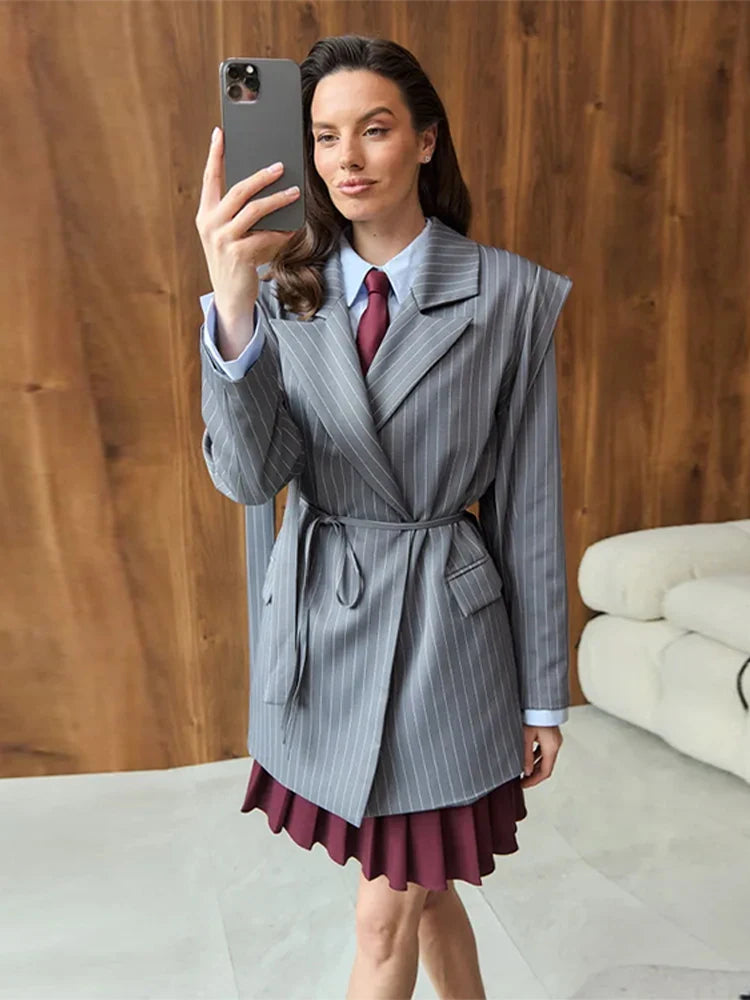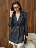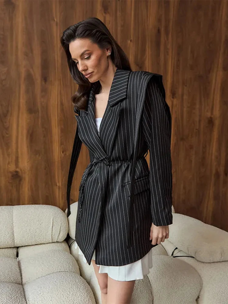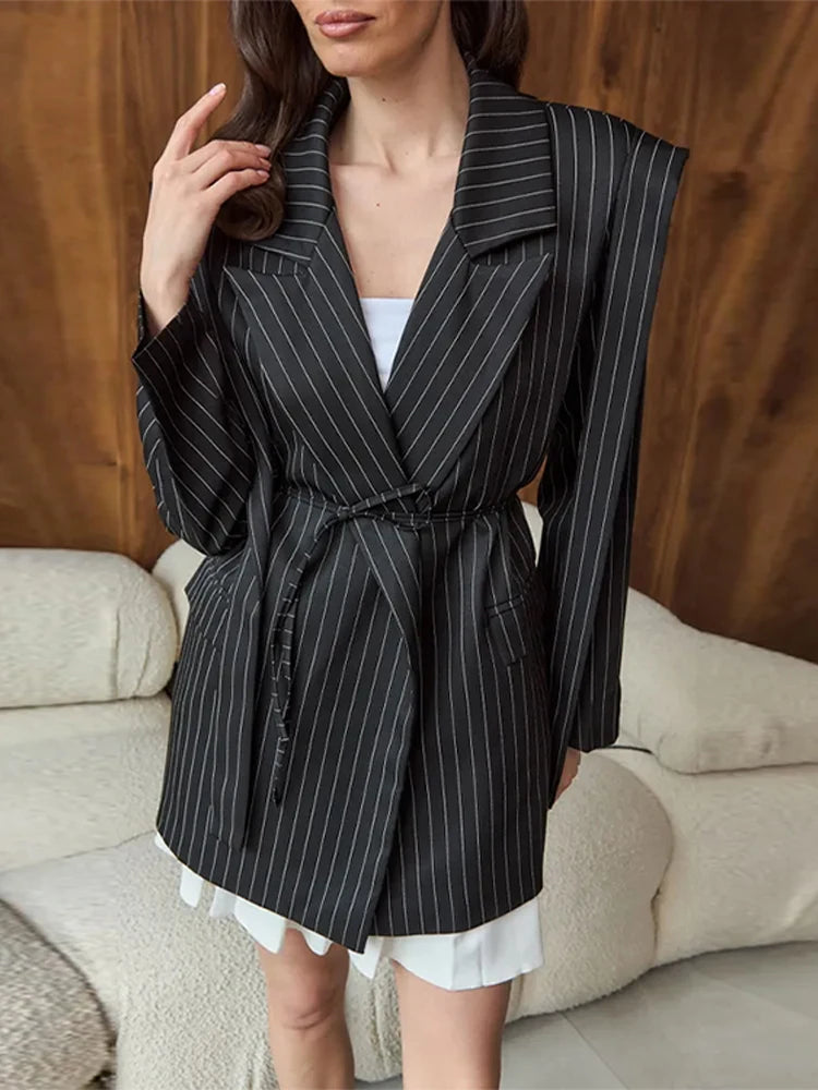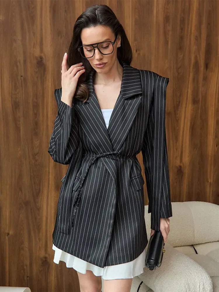 Elegant Striped Slim Women's Blazers Turn-down Collar Shoulder Pad Full Sleeve Waist Cinching Suit Jacket Chic Ladies Outerwear