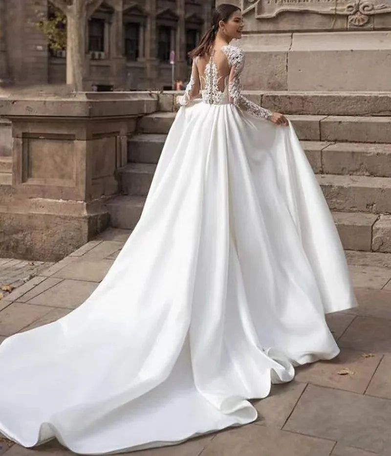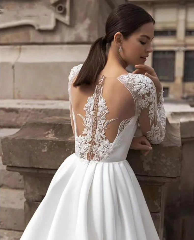 Exquisite A-line Wedding Dress 2026 Boat Neck Long Sleeves Illusion Back Buttons Embroidery Lace Applique Bride Bridal Gowns