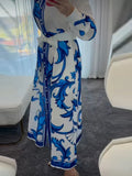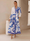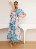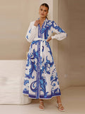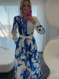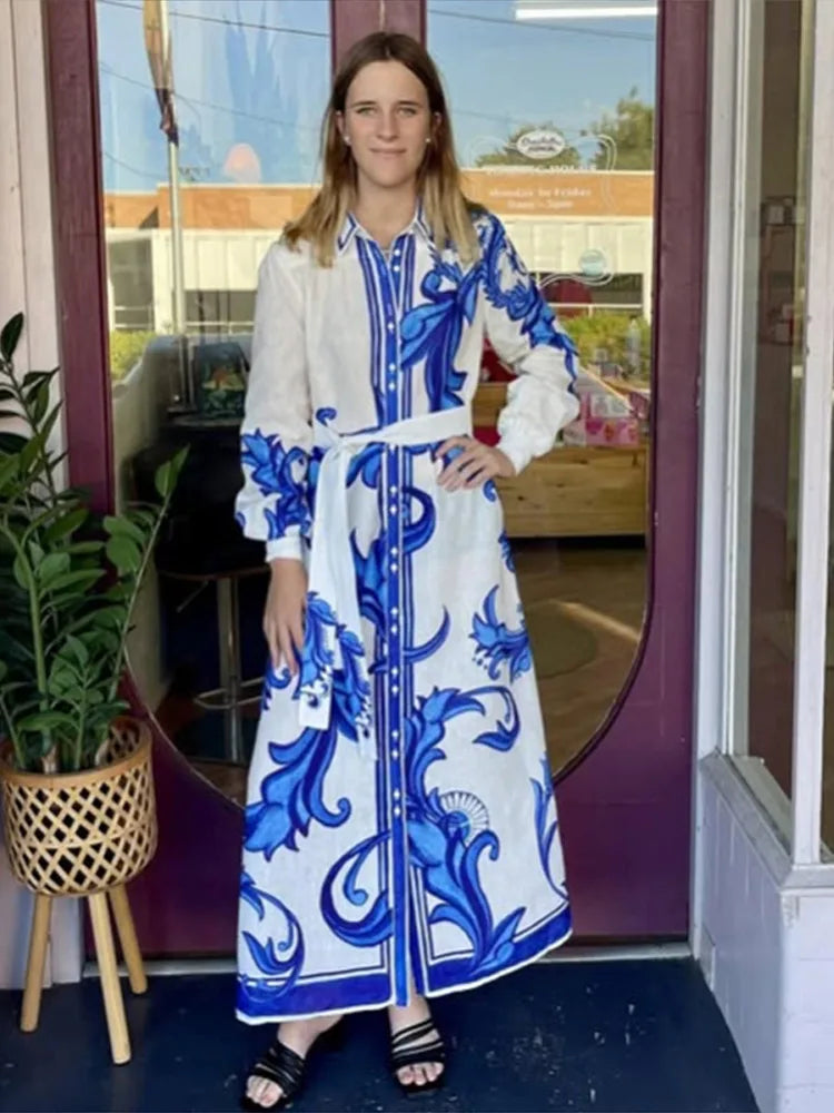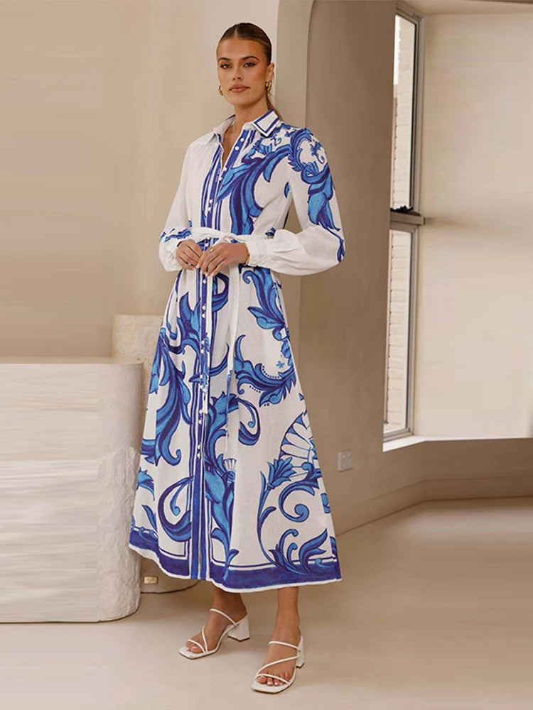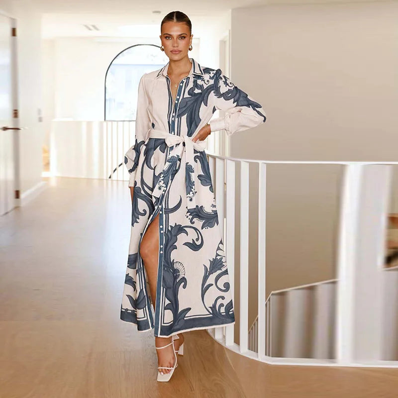 Fashion Printed Slim Women Maxi Dress Lapel Puff Long Sleeve Single Breasted Lace Up Slim Evening Dresses Chic Ladies Robes New