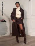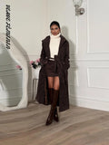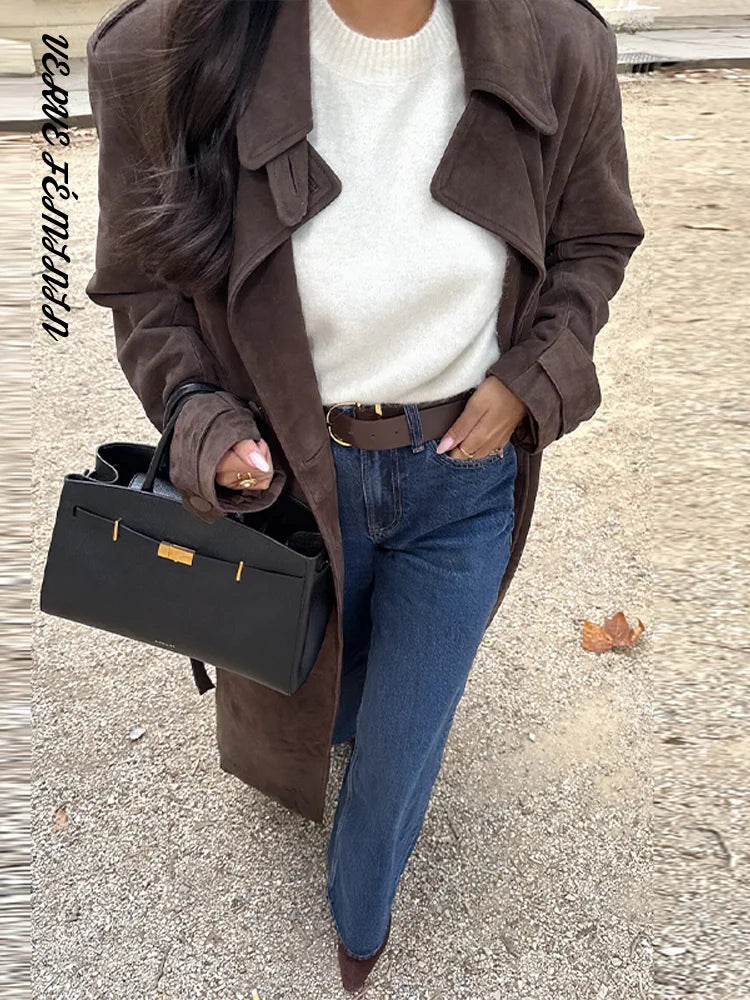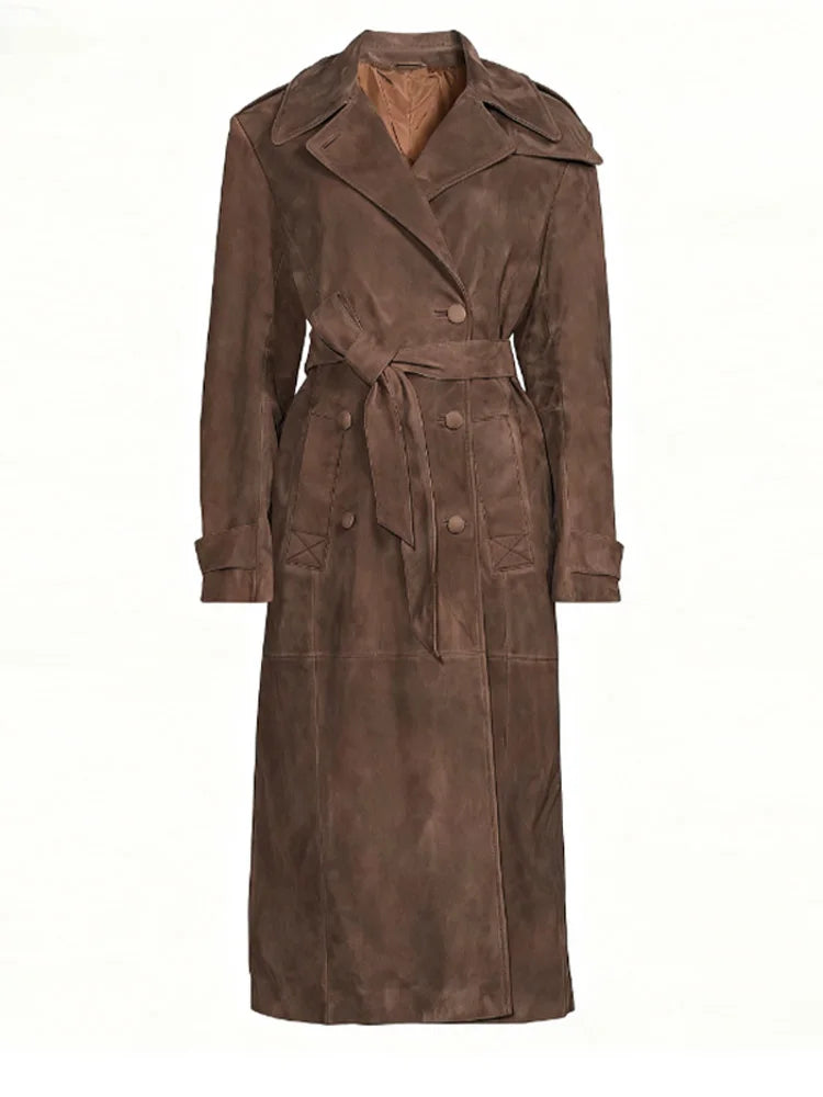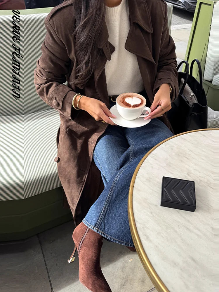 Lapel Epaulet Full Sleeve Lace Up Long Suede Jacket Women Elegant Double Breasted Slim Coats Autumn 2025 Fashion Lady Outerwears