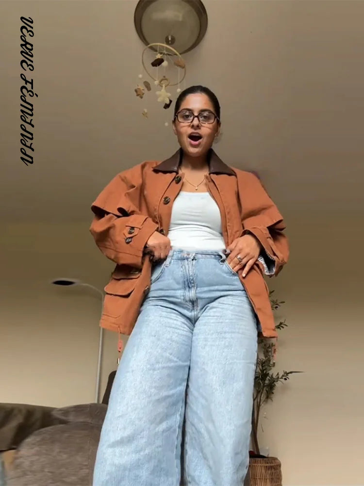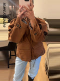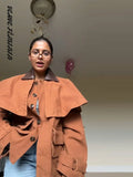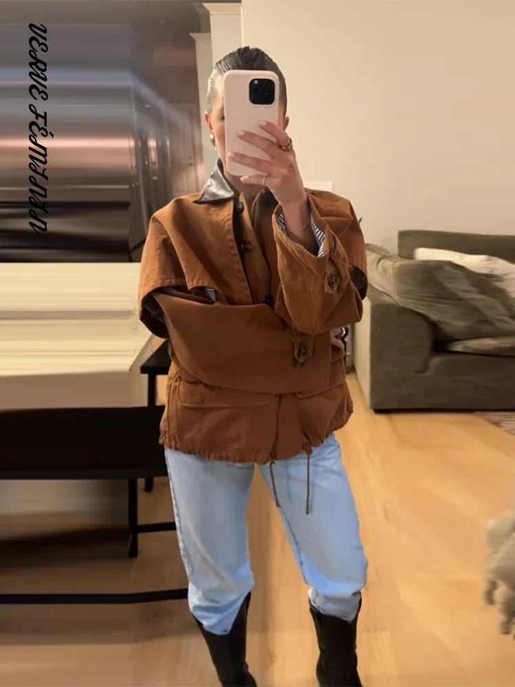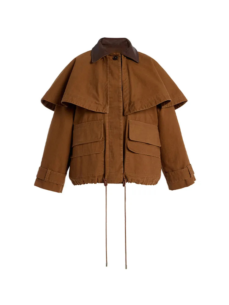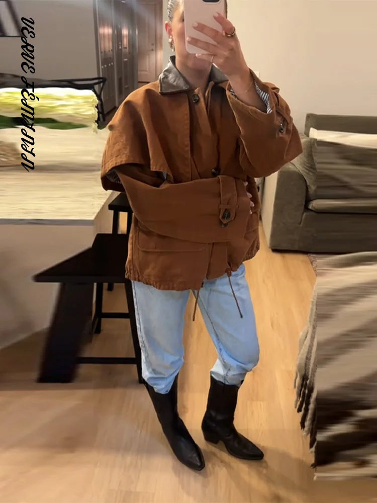 Lapel Leather Patchwork Cape Bomber Jackets Women Elegant Full Sleeve Single Breasted Drawstring Coats Fashion Ladies Outerwears
