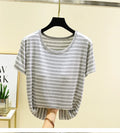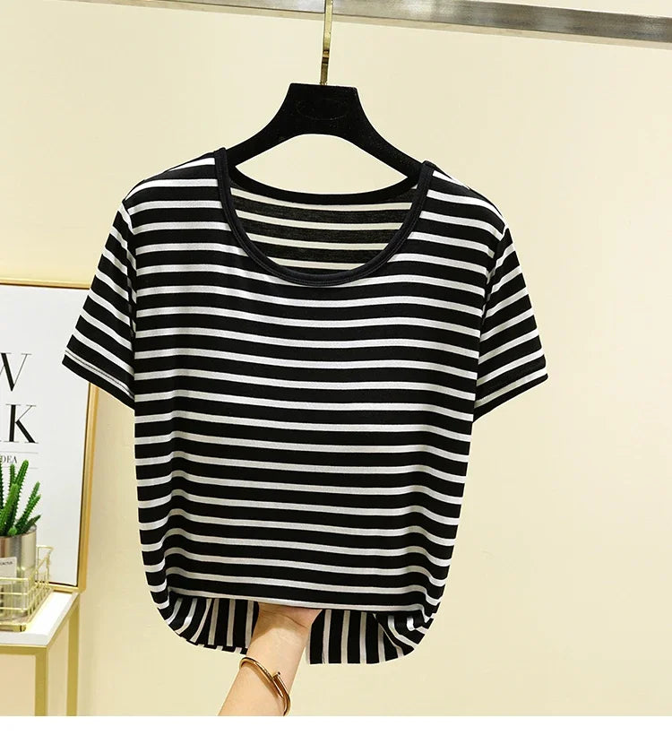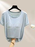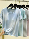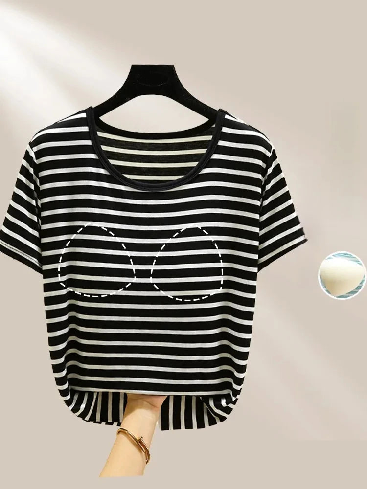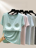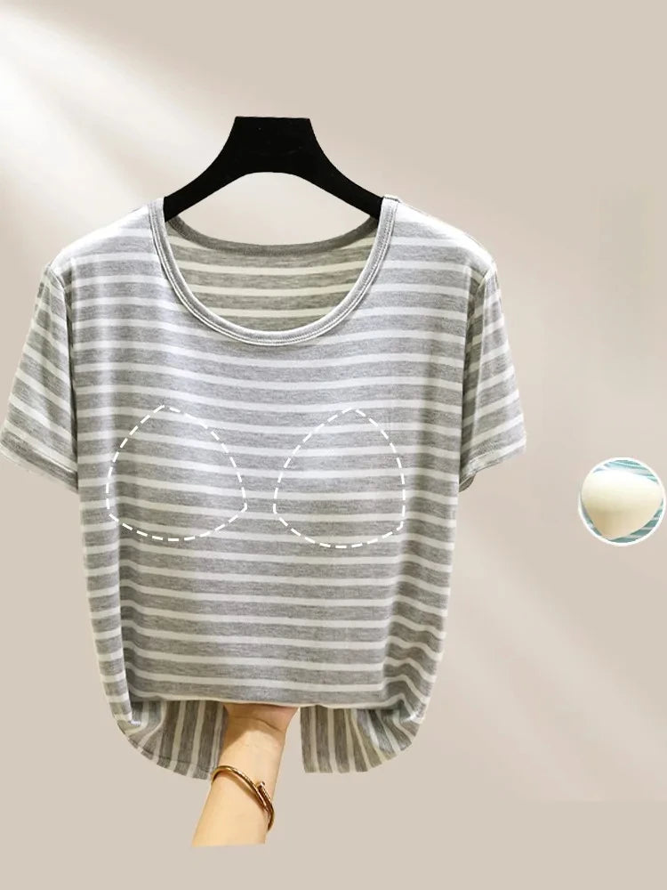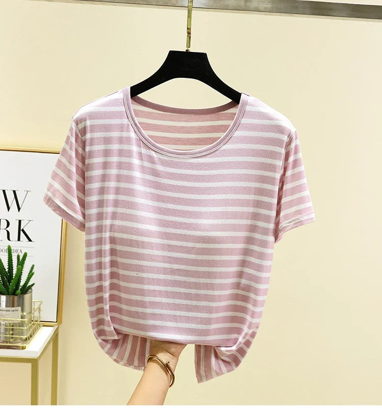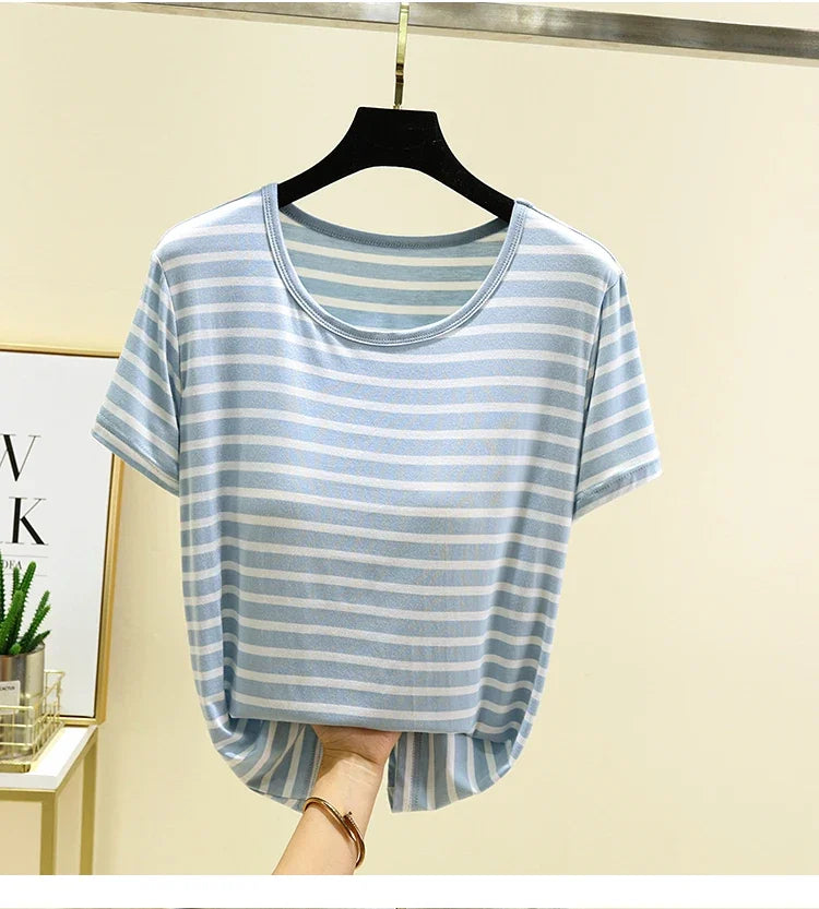 Modal Summer Chest Pad Short Sleeve Top Loose Bra-Free Stripe T-shirt Thin Versatile Outer Wear Bottoming Shirt