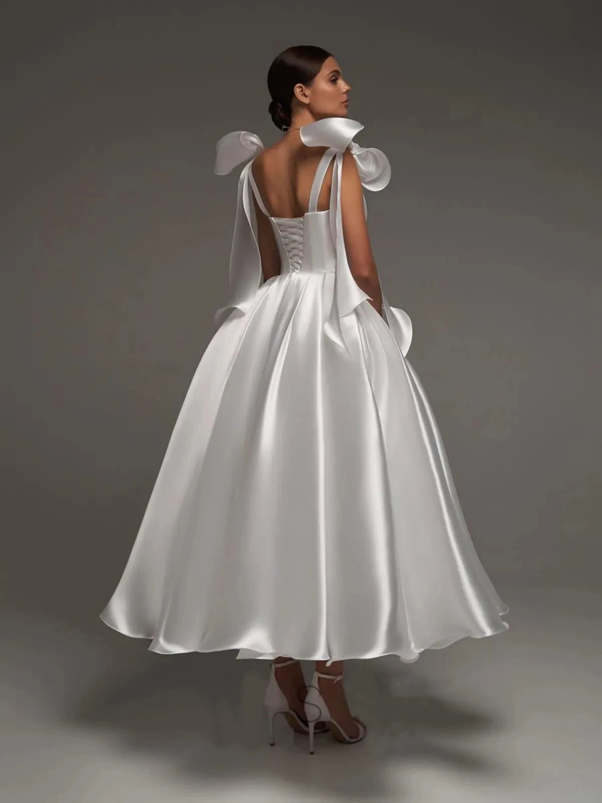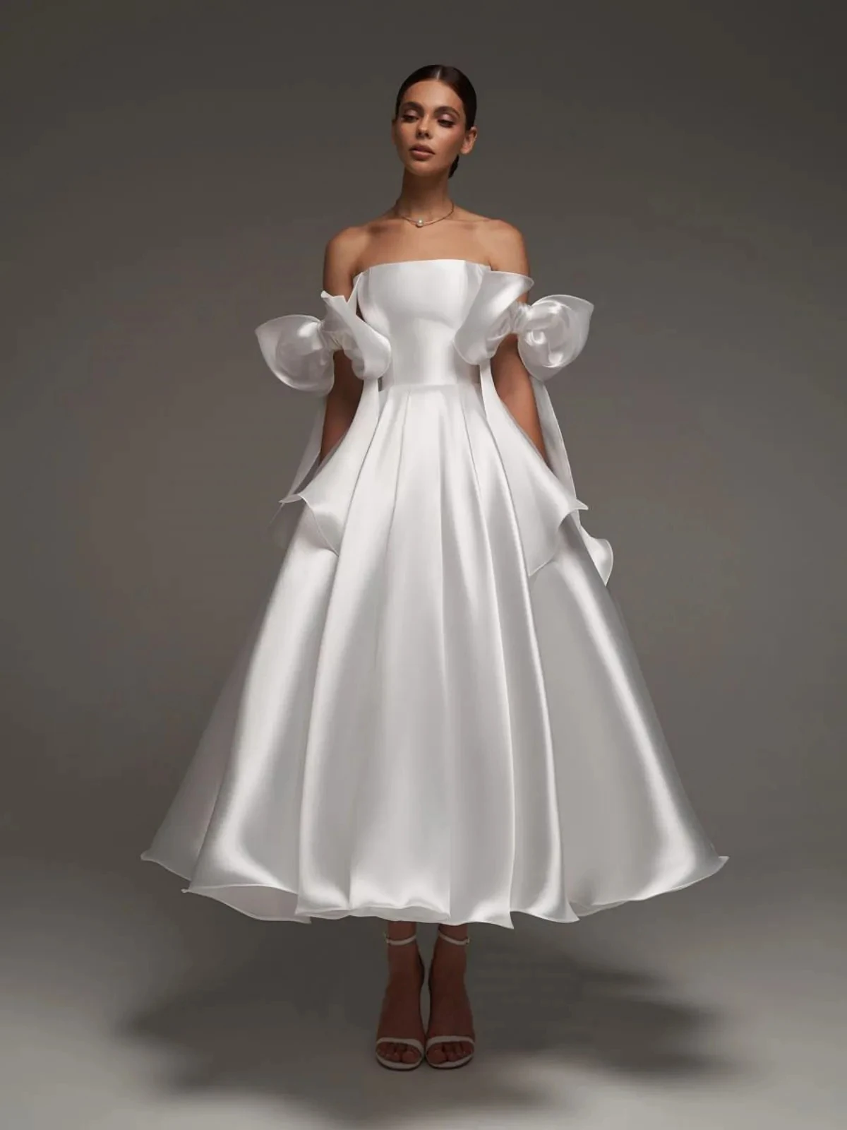 Off Shoulder Princess Wedding Dress A Line Satin Tea Length Princess Bridal Formal Party Gowns Bride Dress Vestidos De Noiva