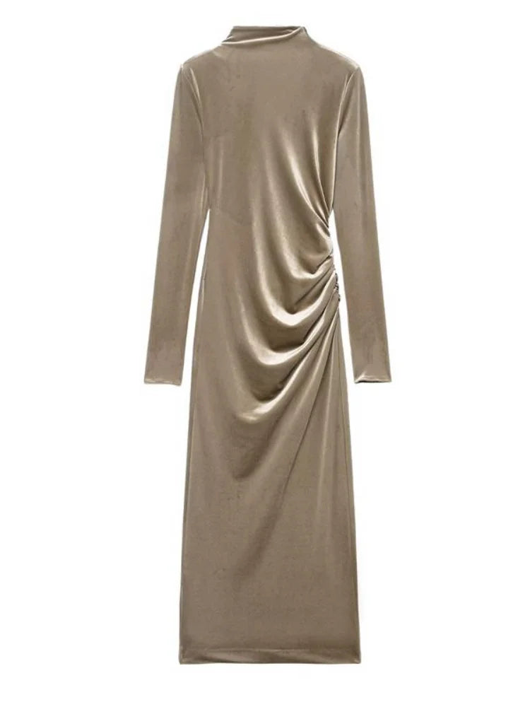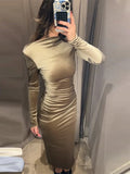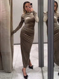 Pleated Shoulder Pad Velvet Long Dress Women Elegant Long Sleeve Backless Waist Cinching Hip Package Party Dresses Lady New Robe