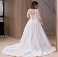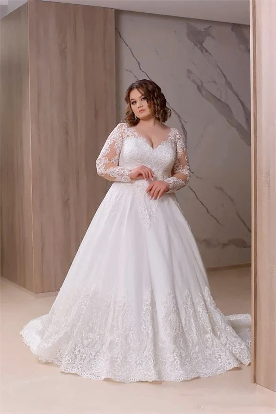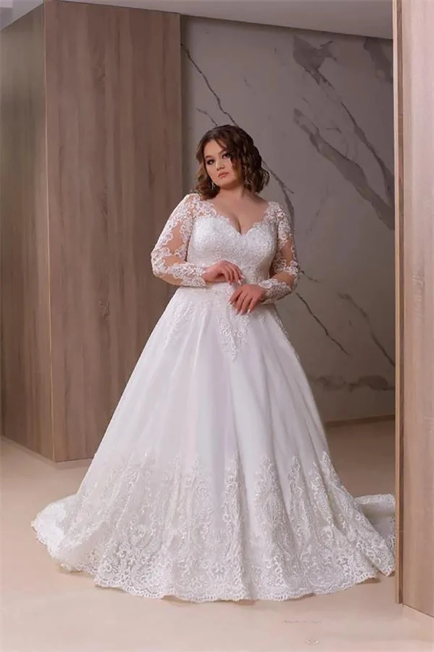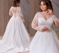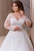 Plus Size A Line Wedding Dresses Bridal Gowns V Neck Long Illusion Sleeve Lace Appliqued Sweep Train