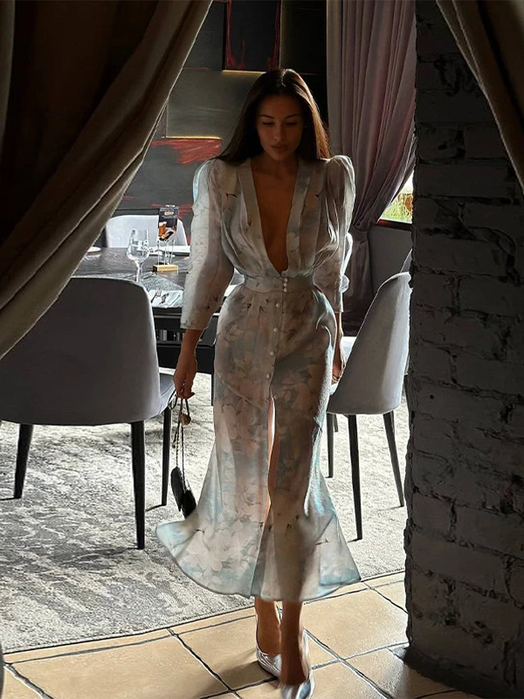 Print V-neck Puff Sleeve Long Dress Women Glamorous Deep V High Waist Front Split Slim Party Dresses New Summer Vocation Vestido