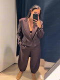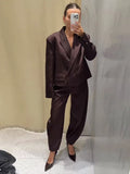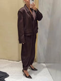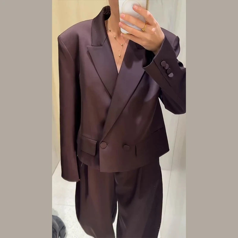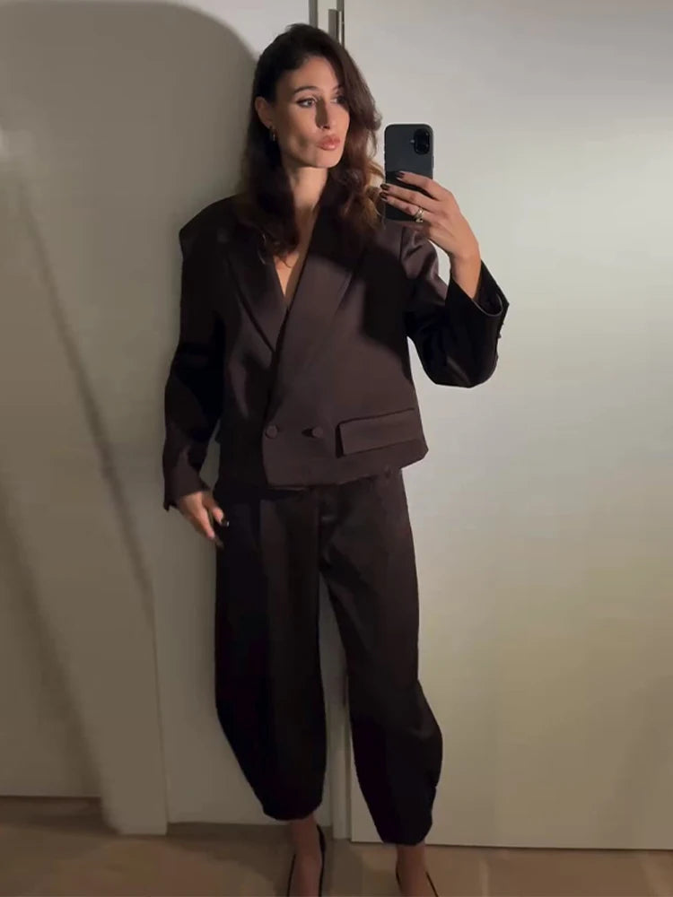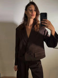 Satin Button Suit Jacket Pants 2 Pcs Suits Women Elegant Lapel Long Sleeve Loose Bomber Coats High Waist Trousers New Lady Sets