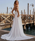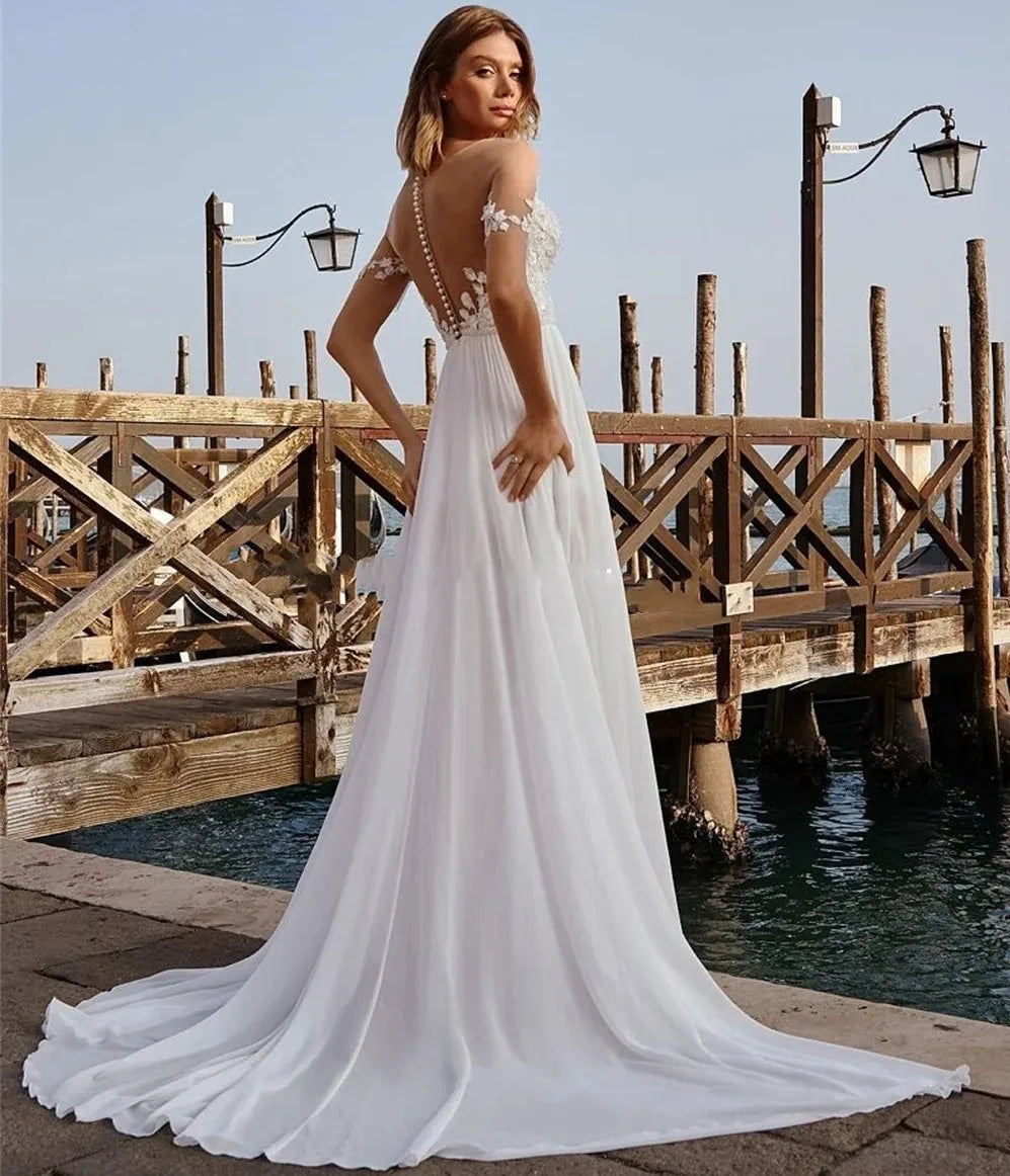 Sexy A Line Wedding Dresses Sheer Illusion Lace Applique Chiffon Bride Gowns Princess Slit Bridal Dress Beach Robe de Mariee