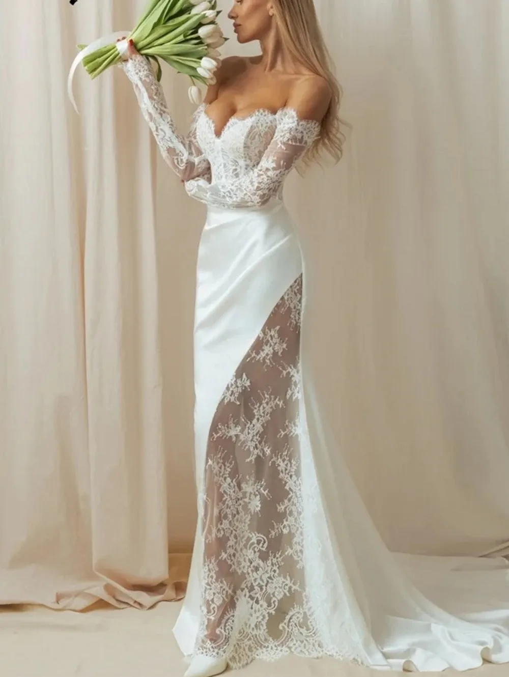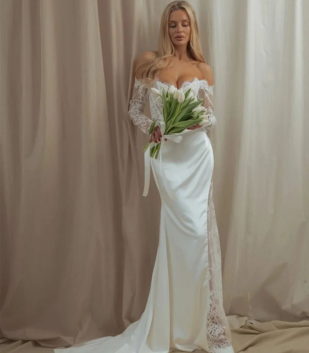 Sexy Mew Mermaid Wedding Dress 2026 Off the Shoulder Long Sleeves Split Lace Satin Bride Party Bridal Gowns Boho Vestidos