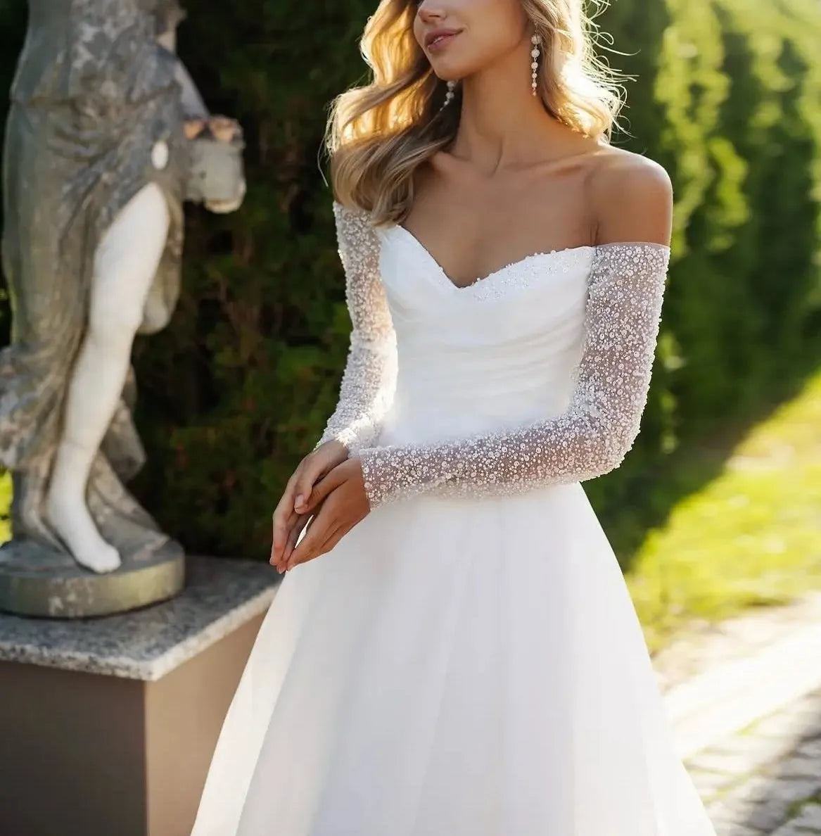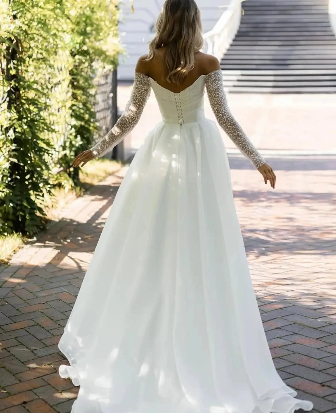 Shiny Beaded Sequined Wedding Dresses 2026 Detachable Long Sleeves Strapless A Line Organza Bride Dress Bridal Gowns Sweep Train