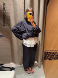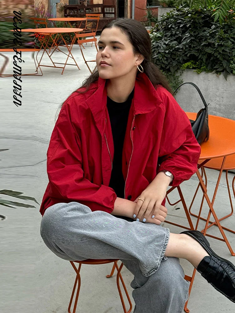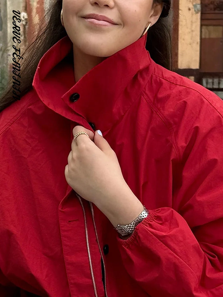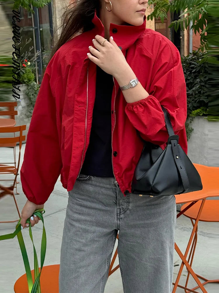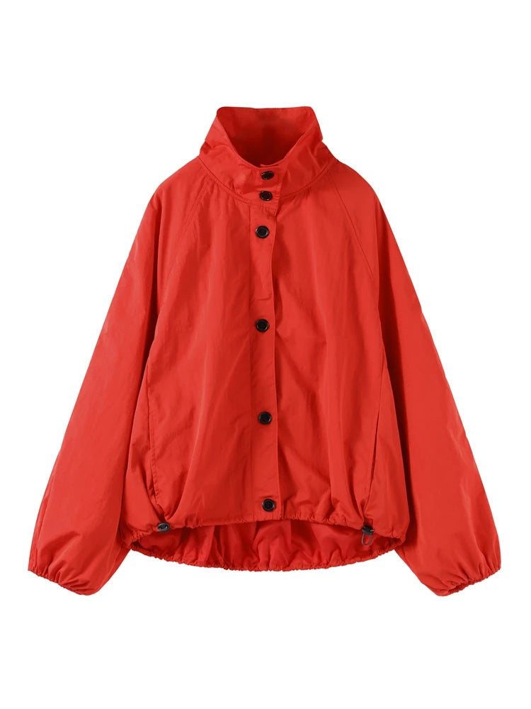 Stand Collar Button Solid Full Sleeve Bomber Jacket Women Casual Lantern Sleeves Loose Fitting Coats Autumn 2025 Chic Outerwears