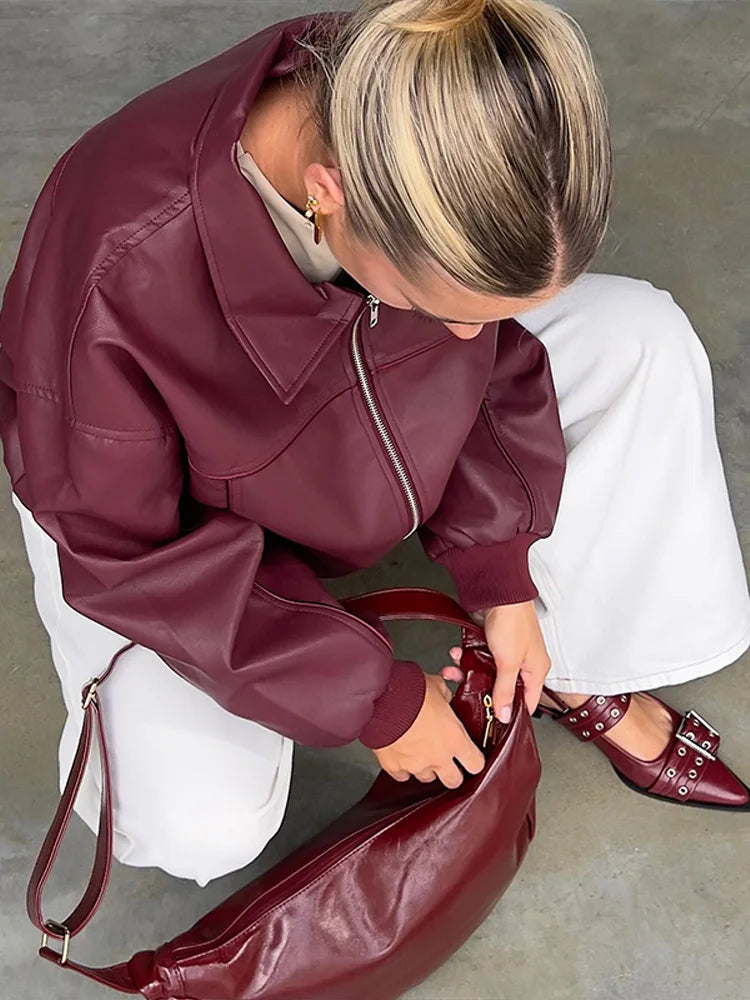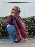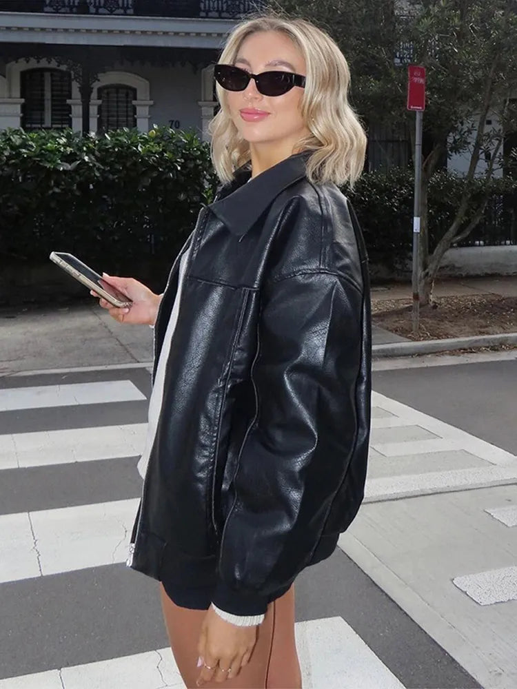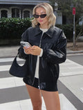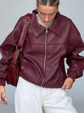 Street Lapel Zipper Faux Leather Jackets For Women Turn-down Collar Lantern Long Sleeve Loose Coats Fashion Cool Girls Outerwear