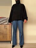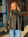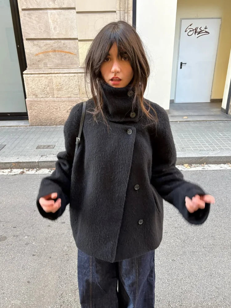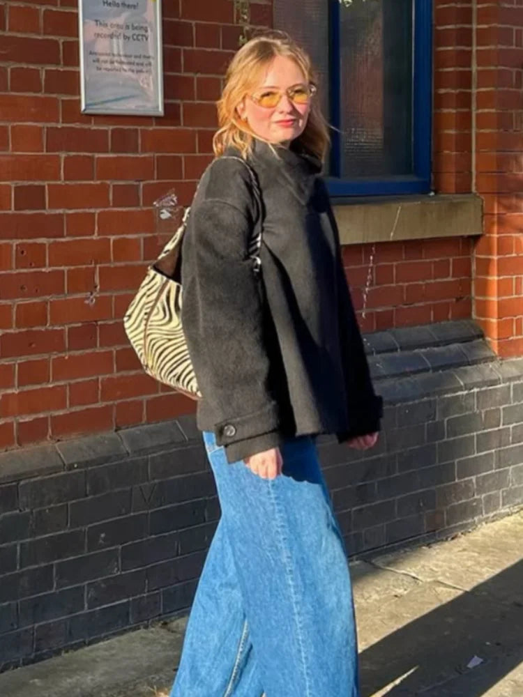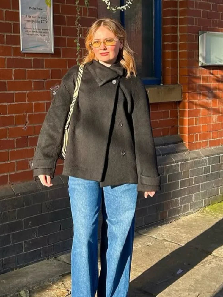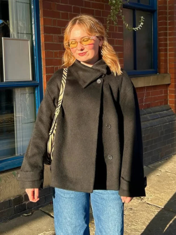Street Solid Loose Women's Woolen Coat Stand Collar Full Sleeve Slant Opening Single Breasted Jackets New Chic Ladies Streetwear